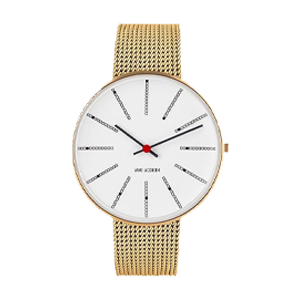 Den sista klockan som Arne Jacobsen designade var hans Bankers-klocka. Denna klocka designades till Danmarks Nationalbank år 1971. Jacobsen vann tävlingen om vem som skulle få designa Nationalbanken år 1960. Byggnaden stod först färdig år 1978 – sju år efter hans död. Arne Jacobsens Bankers klocka pryder nu Nationalbankens foajé. Du hittar Arne Jacobsens sista klocka både som armbandsur, väggur och bordsur här hos Vibholm. Du kan till exempel välja ett Arne Jacobsens Bankers-ur i IP guldpläterad stål med vit urtavla och blå läderrem.