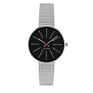 Precis som med alla andra klockor från Arne Jacobsen, hittar du även City Hall-klockan både som armbandsur, bordsur och väggur. Arne Jacobsens City Hall finns i många olika modeller. Du kan till exempel välja ett Arne Jacobsen City Hall-ur i svart rostfritt stål med svart urtavla och svart IP mesh-länk. Detta är den senaste utgåvan av den klassiska City Hall-klockan. Om du inte gillar helsvarta klockor så finns det massor av andra möjligheter. Du kan till exempel välja en utgåva i rostfritt stål med en stor vit urtavla och mesh-länk.