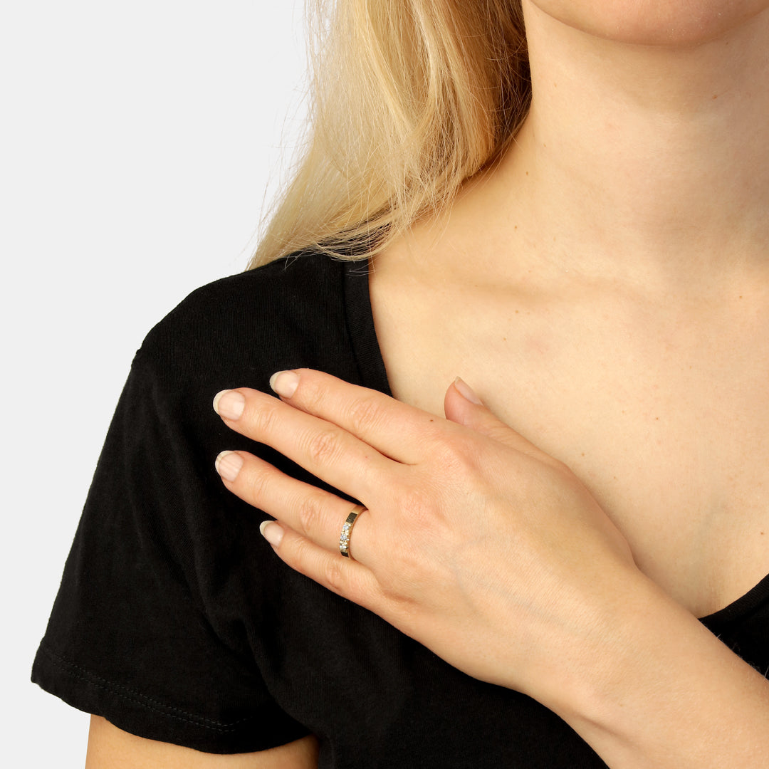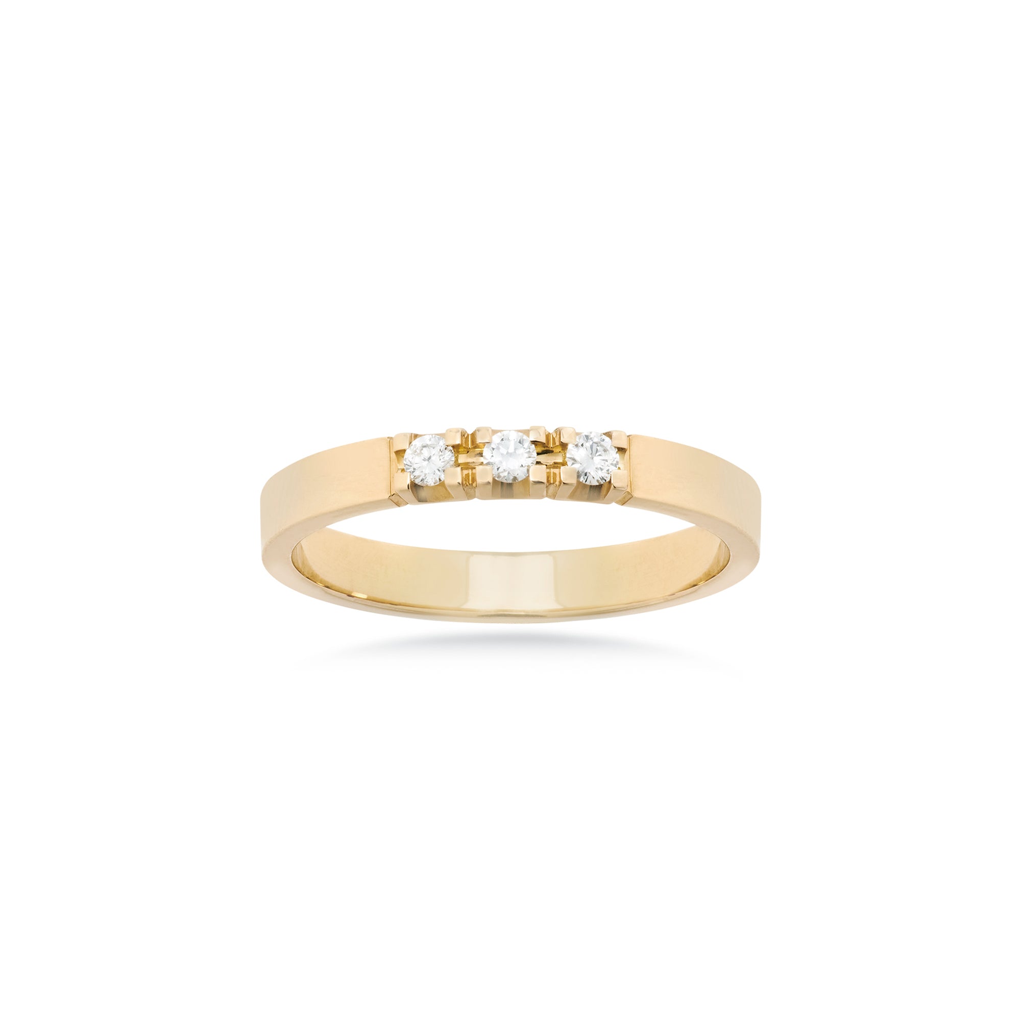 Tillverkad i 14k guld, utstrålar ringen en varm lyster som kompletterar alla hudtoner. De tre diamanterna, vardera 0,05 ct. w/vs, är noggrant inramad för att säkerställa maximal glans och skönhet. Diamanterna tillför en subtil ALLIANCE som gör ringen till ett oförglömligt smycke.