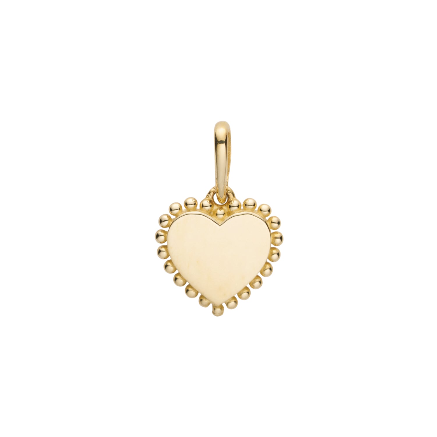 Det gyllene hänget har en slät och blank yta som fångar ljuset vackert och framhäver dess varma glöd. De små kulorna som omger hjärtat ger en delikat detalj som gör smycket ännu mer unikt. Det är ett hänge som inte bara ser fantastiskt ut, utan också känns bekvämt att bära.