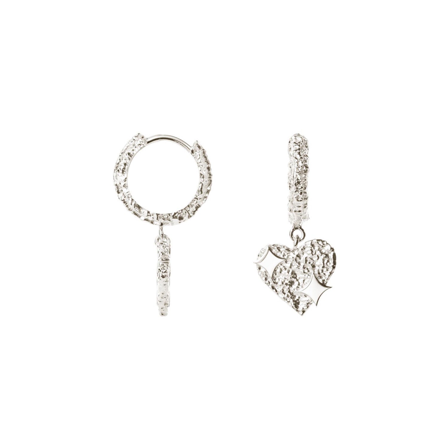 Dessa örhängen är designade med en vacker hjärtform som symboliserar kärlek och elegans. Silvrets blanka yta reflekterar ljuset på ett sätt som drar till sig uppmärksamhet utan att vara överväldigande. Örhängena har en textur som ger dem en unik karaktär och djup, vilket gör dem till ett perfekt val för den stilmedvetna kvinnan.