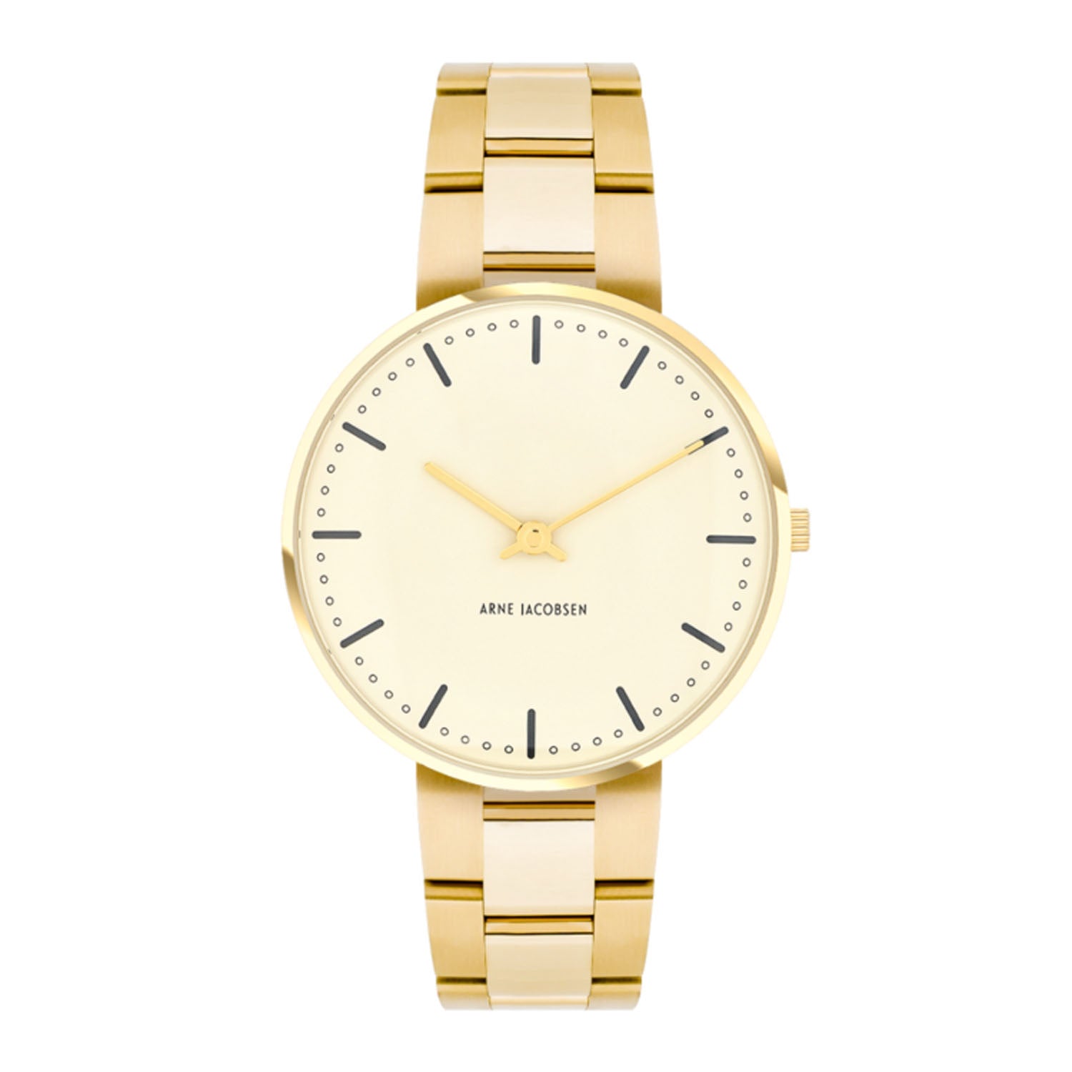 Denna klocka från City Hall-kollektionen har en 34 mm urtavla som är både diskret och iögonfallande. Det guldfärgade armbandet känns bekvämt mot huden och ger en sofistikerad touch till din handled. Den enkla men eleganta urtavlan framhäver Arne Jacobsens ikoniska design, där minimalism möter funktionalitet.