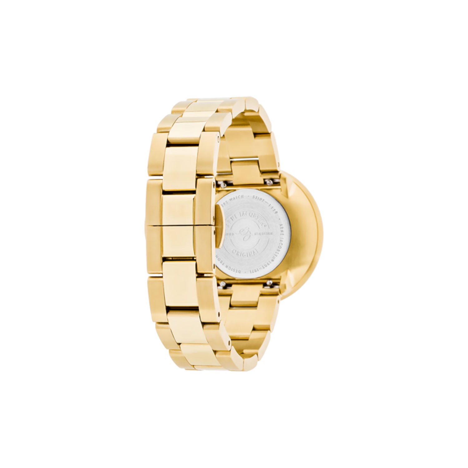 Den gyllene färgen spelar vackert med ljuset och skapar ett varmt sken, vilket gör klockan till ett perfekt tillbehör för både vardag och festliga tillfällen. Med den här klockan får du inte bara ett exakt tidsinstrument, utan också ett stycke designhistoria som återspeglar din känsla för stil och kvalitet.