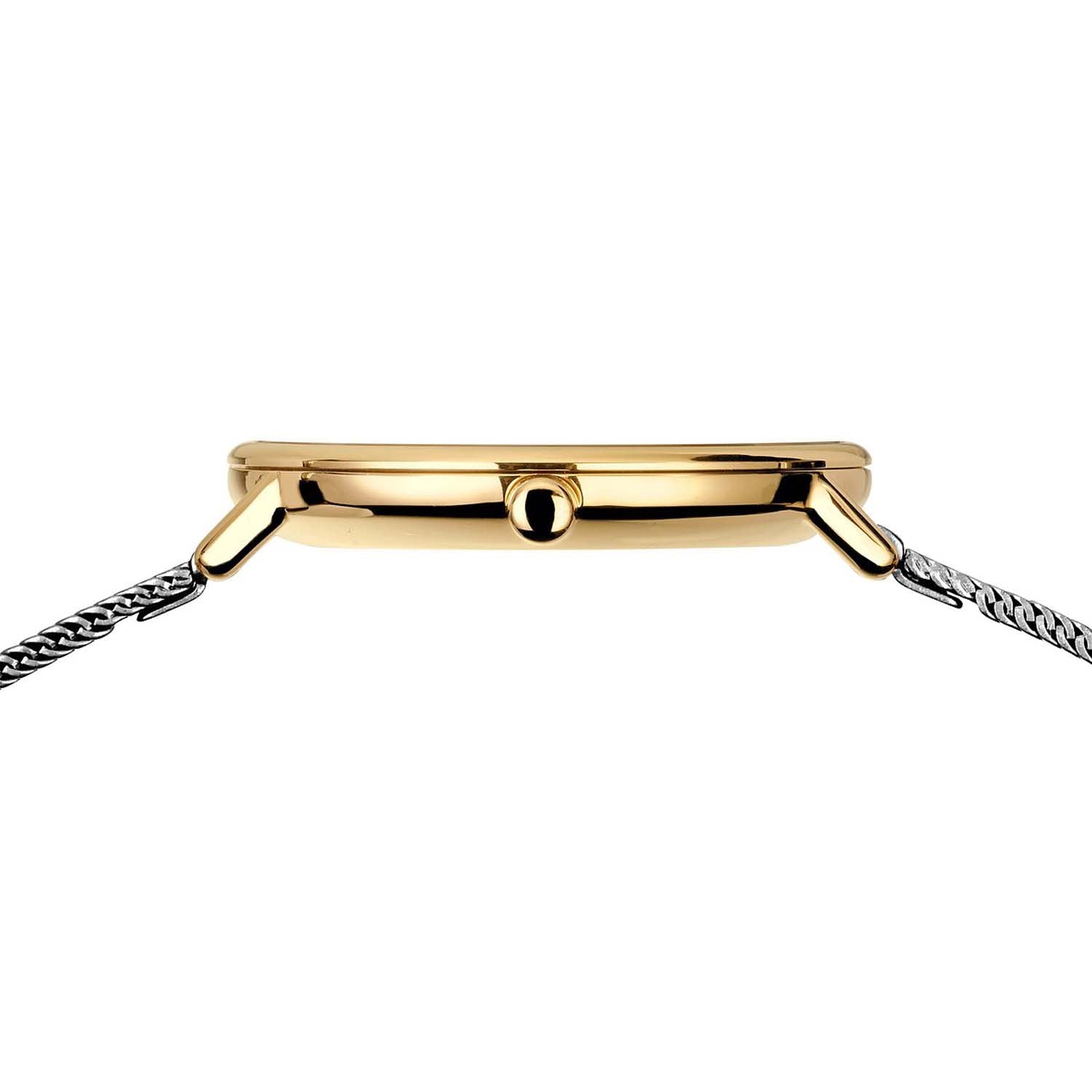 Klockans smala profil och 29 mm stora urtavla gör den till ett subtilt men ändå iögonfallande tillskott till vilken outfit som helst. Den vita urtavlan skapar en vacker kontrast till den guldfärgade ramen, medan det silverfärgade mesh-remmen ger en modern touch. Kombinationen av dessa element ger klockan en lätt och elegant känsla som är både bekväm och snygg.