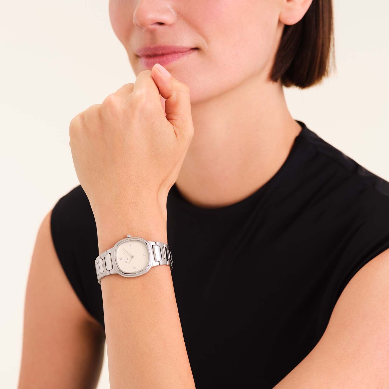 Klockan är tillverkad av glänsande silverfärgat rostfritt stål, vilket ger den ett lyxigt och sofistikerat utseende. Den vita urtavlan skapar en vacker kontrast till det silverfärgade armbandet, vilket gör den till ett iögonfallande accessoar.