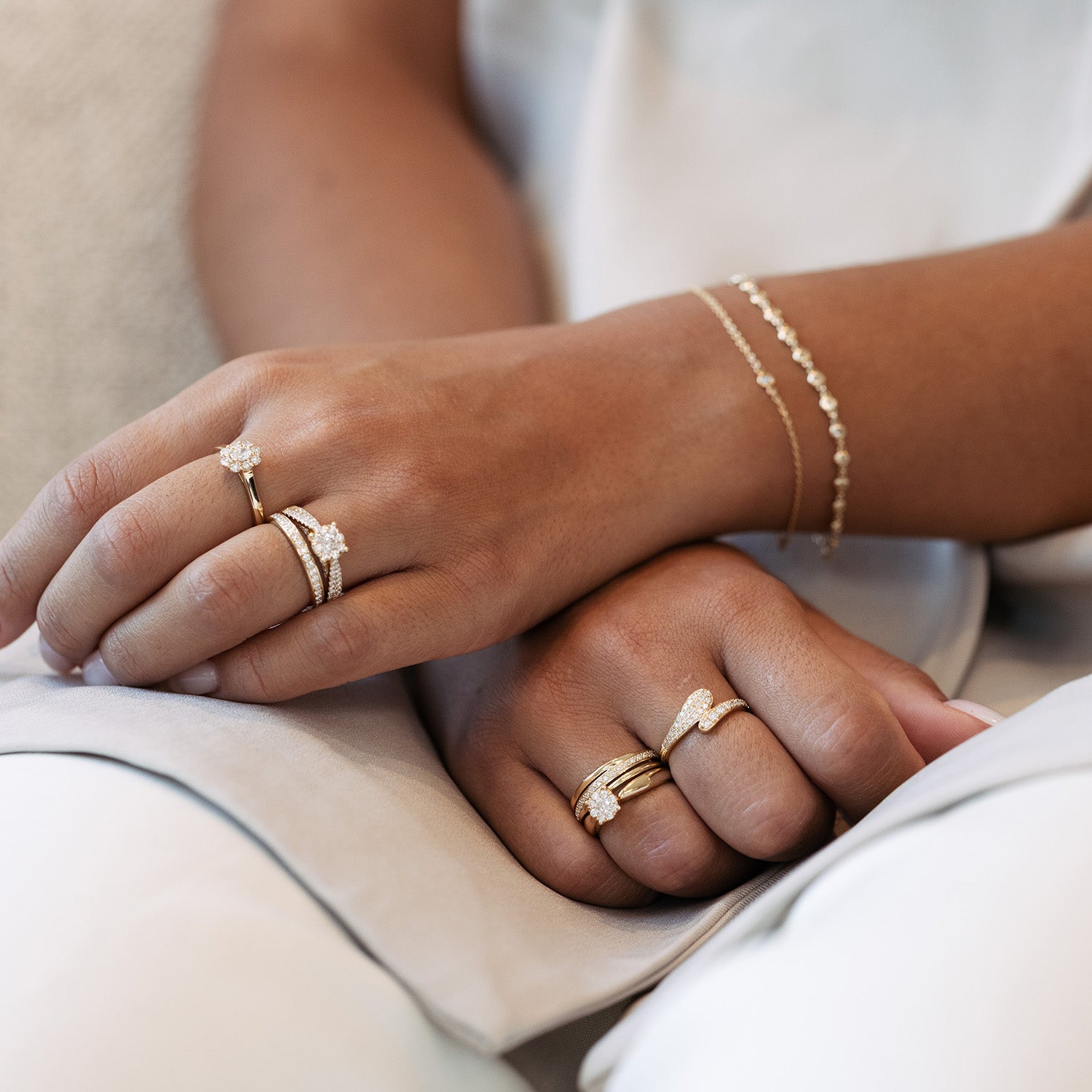 Ringens gyllene nyans harmoniserar perfekt med diamanternas klara glans, vilket gör den till ett iögonfallande smycke. Stenarnas illusionära infattning ger intrycket av större diamanter, vilket förstärker ringens elegans och sofistikering.