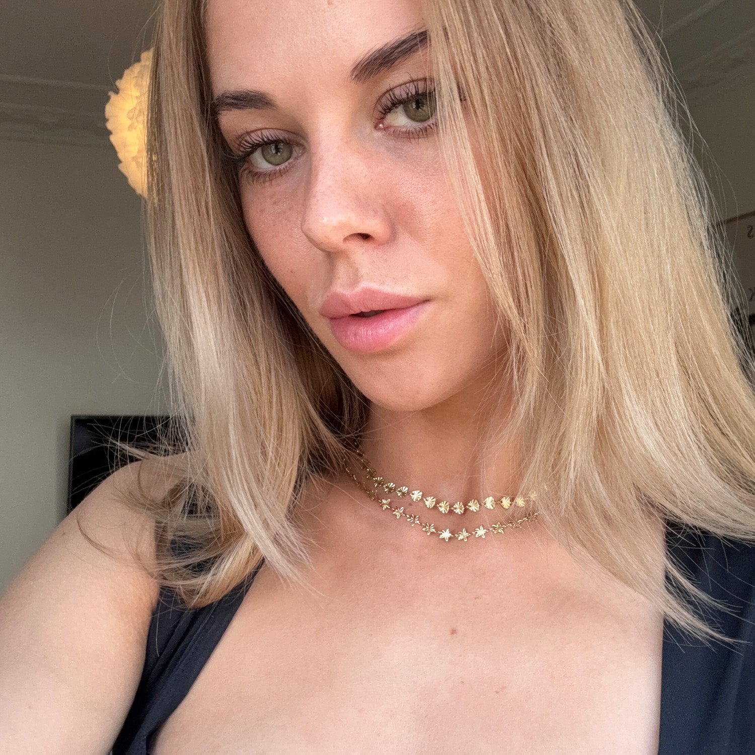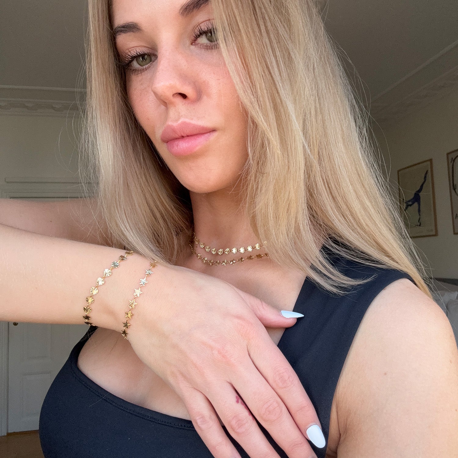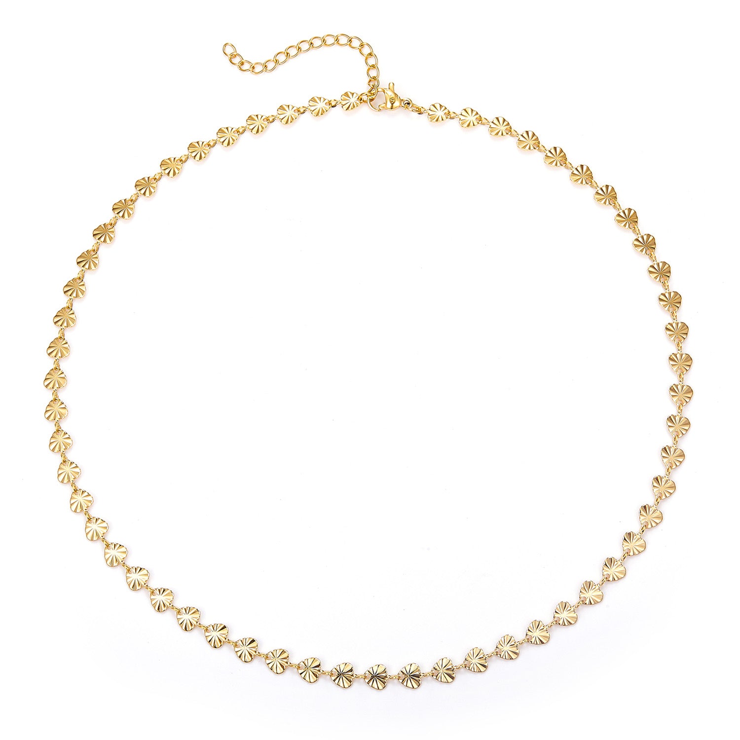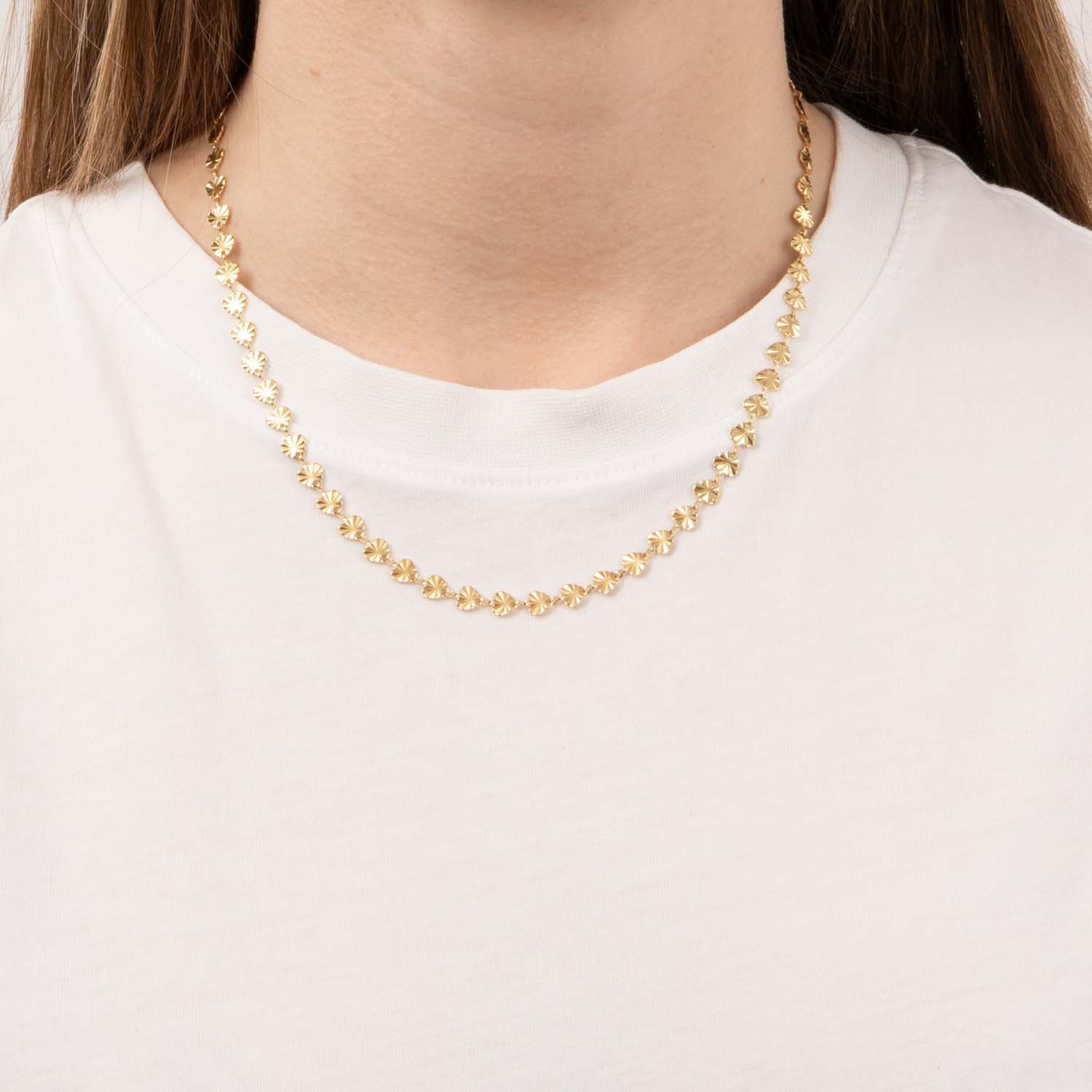 På bilden kan du se hur halsbandets små, detaljerade element fångar ljuset och skapar en subtil glans. Den fina kedjan är lätt och bekväm att bära, vilket gör den idealisk för vardagsbruk. Den justerbara längden säkerställer att halsbandet passar perfekt, oavsett vilken stil du väljer. Kedjans mönster på plattorna är identiskt på fram- och baksidan.