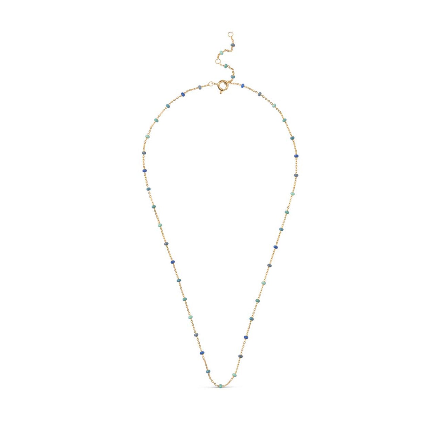 Halsbandet är en delikat kombination av små, färgglada pärlor som skapar en livlig och sofistikerad estetik. De blå och gröna nyanserna ger en frisk fläkt, medan de gyllene detaljerna tillför en touch av lyx. Den fina kedjan och de små pärlorna ger ett lätt och luftigt utseende som känns bekvämt mot huden.