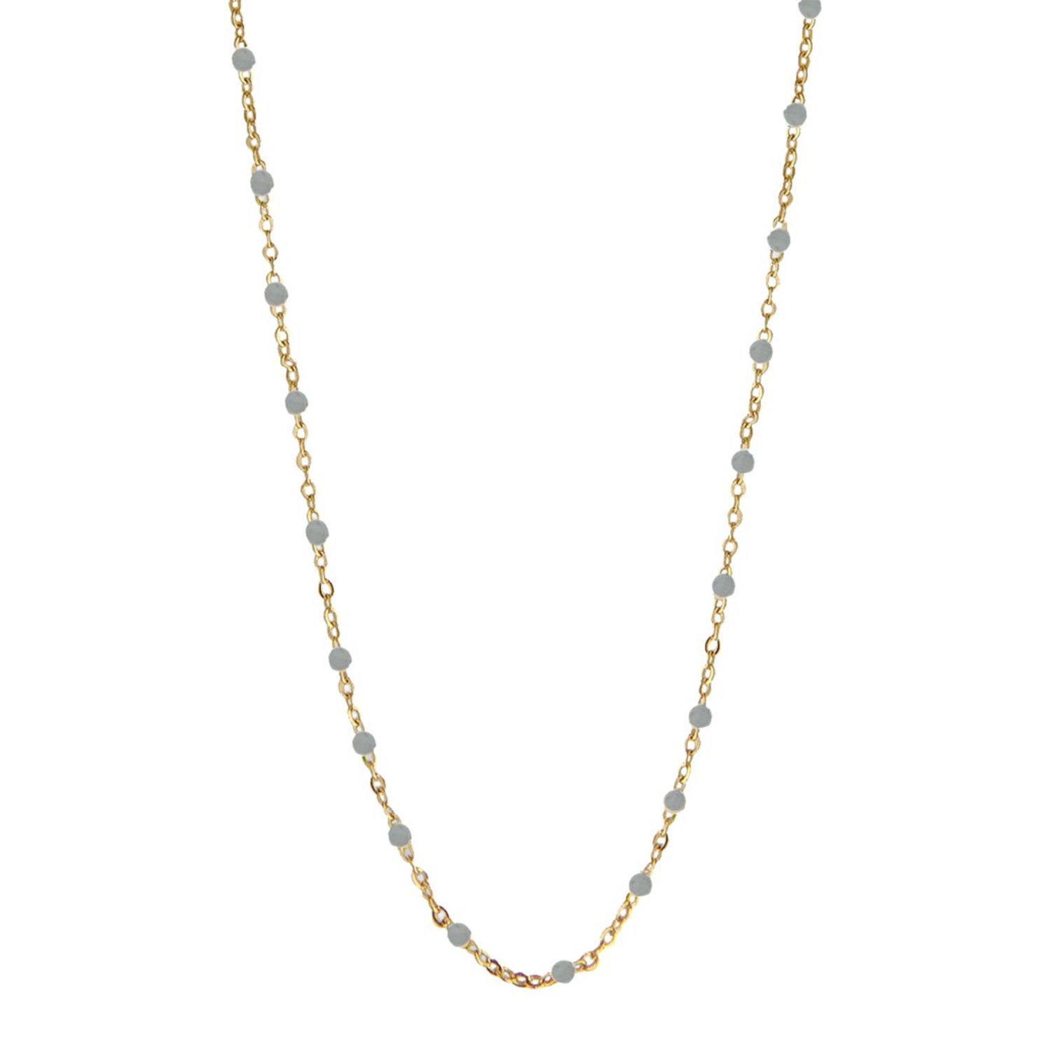 Halsbandets gyllene nyans framhäver de känsliga grå pärlorna som är jämnt fördelade längs kedjan. Detta skapar en harmonisk balans mellan det varma guldet och de svala gråtonerna. Den fina guldpläterade silverkedjan känns lätt och bekväm när den bärs och ger en touch av lyx till vilken outfit som helst.