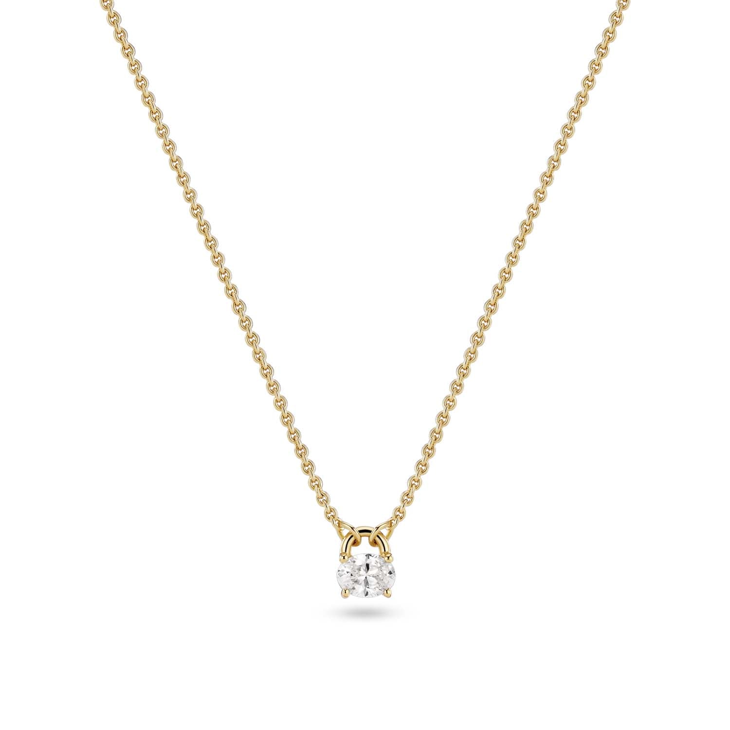 Bilden visar halsbandets delikata design med en fin kedja som vackert framhäver det ovala hänget. Den guldpläterade ytan lyser med ett varmt sken, medan zirkoniastenarna fångar ljuset och skapar en subtil men ändå iögonfallande effekt. Halsbandet känns lätt och bekvämt att bära, vilket gör det idealiskt för vardagsbruk eller som en elegant accessoar för speciella tillfällen.