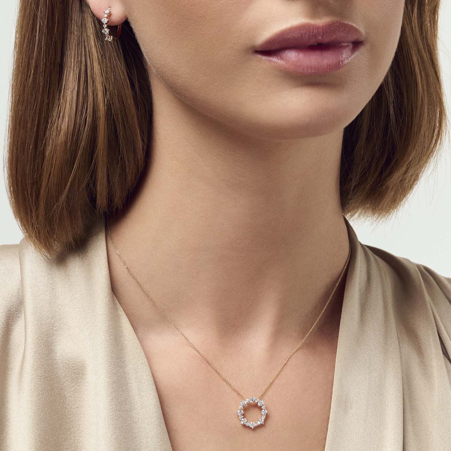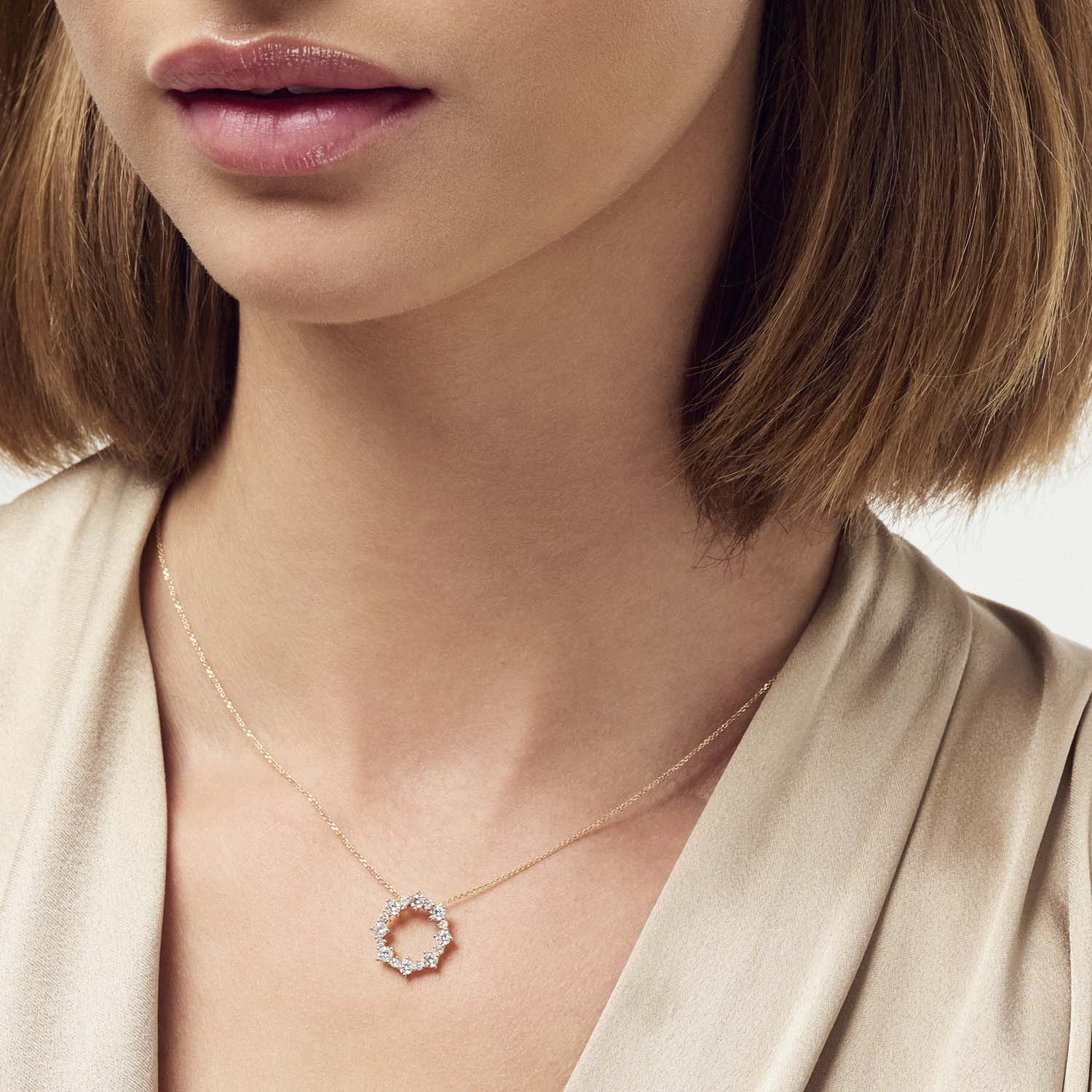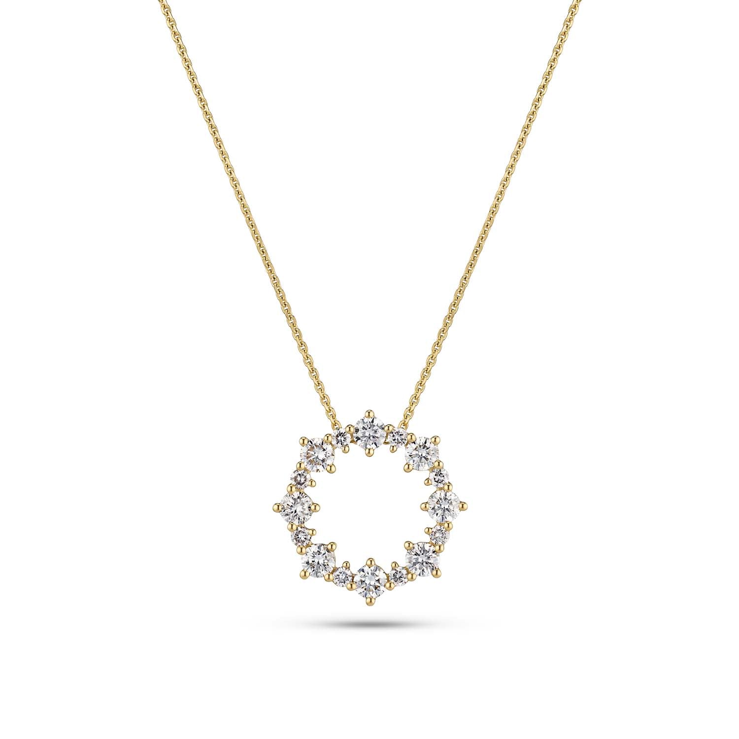 Den gyllene kedjan framhäver de briljanta diamanterna arrangerade i en cirkulär form, vilket skapar en sofistikerad och iögonfallande effekt. Guldets varma glöd i kombination med diamanternas klara briljans ger halsbandet en lyxig och tidlös känsla.