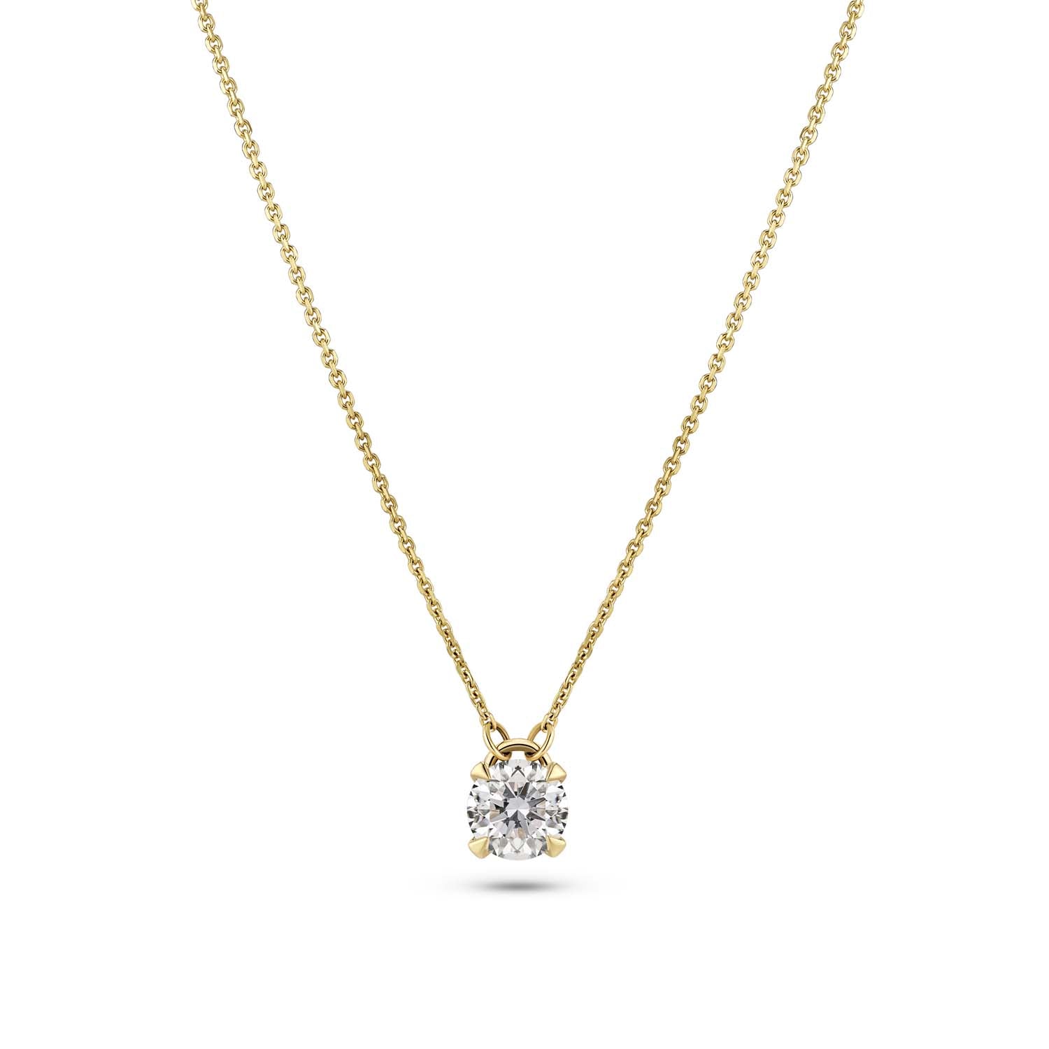 Den fina guldkedjan är både stark och delikat, vilket gör den bekväm att bära hela dagen lång. Diamanten är noggrant infattad för att säkerställa maximal ljusreflektion, vilket ger den en strålande glans. Det subtila skenet från guldet framhäver diamantens klara skönhet, vilket gör halsbandet till ett iögonfallande smycke.