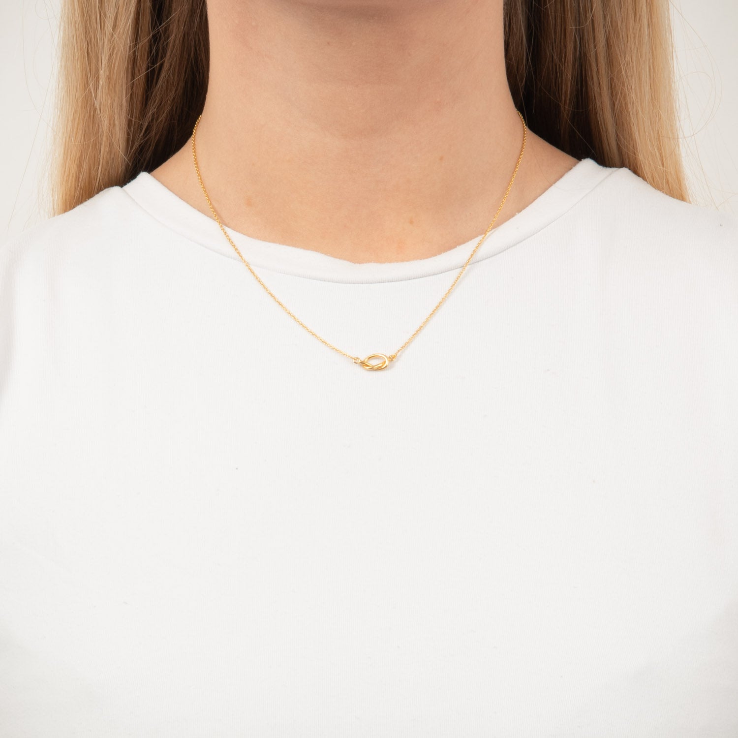 Halsbandet är tillverkat i guldpläterat silver, vilket ger det en varm, gyllene lyster som kompletterar alla hudtoner. Den enkla knuten symboliserar evighet och anslutning, vilket gör den till ett meningsfullt smycke.