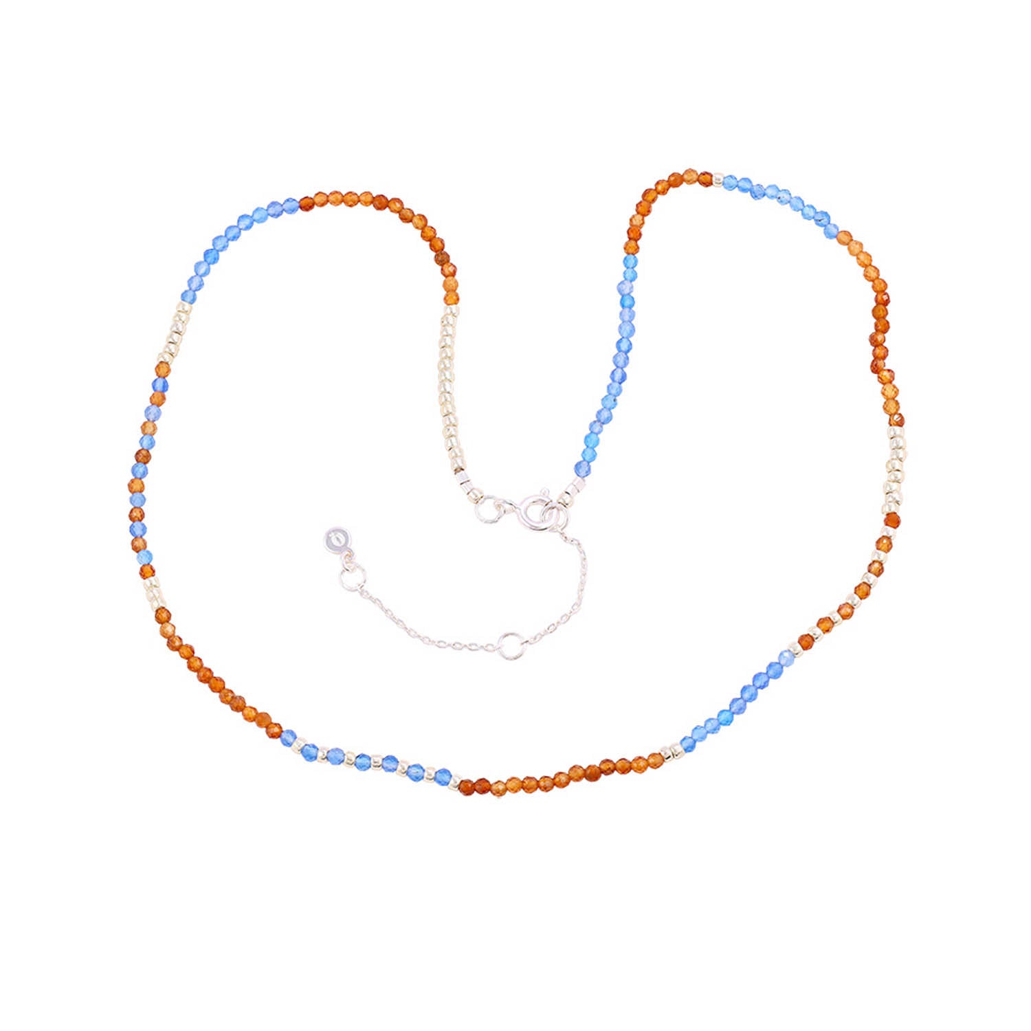 Halsbandet är tillverkat i silver och utstrålar en subtil glans som kompletterar de färgglada pärlorna. De blå, orange och bruna pärlorna är arrangerade i ett harmoniskt mönster som ger ett livfullt och modernt utseende. Den fina kedjan känns lätt och bekväm mot huden, vilket gör den idealisk för vardagsbruk.