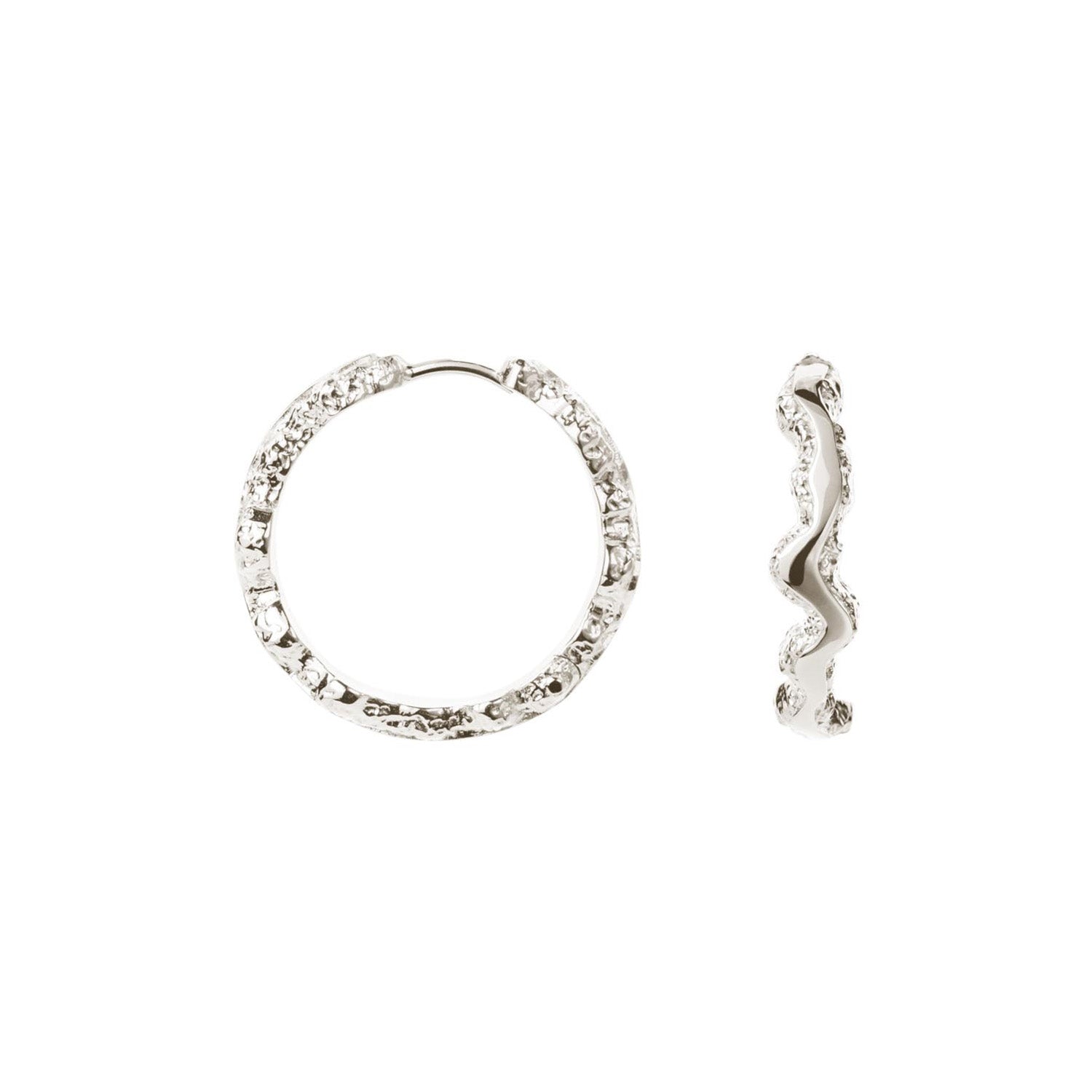 Dessa örhängen är designade för kvinnor som vill ge sin look en touch av glamour. Den släta silverstrukturen reflekterar ljuset vackert och skapar en iögonfallande effekt. Örhängena har en vågig form som ger en dynamisk dimension till looken, vilket gör dem till ett perfekt val för dig som vill sticka ut.
