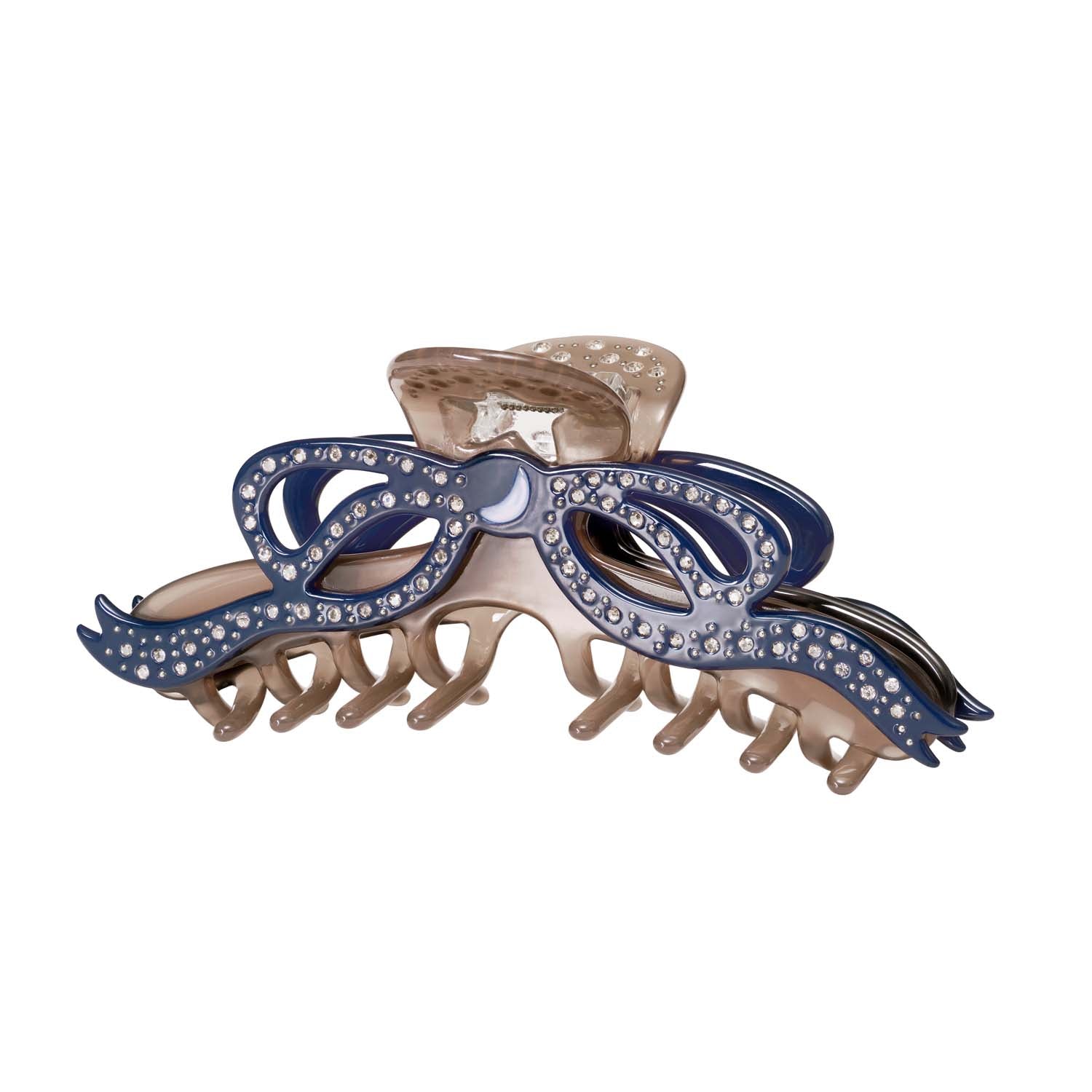 Hårspännet presenterar en harmonisk kombination av blå och bruna nyanser, vilket skapar en varm och inbjudande färgpalett. Den släta acetatytan känns bekväm i handen och säkerställer att spännet sitter stadigt i håret utan att skada det.