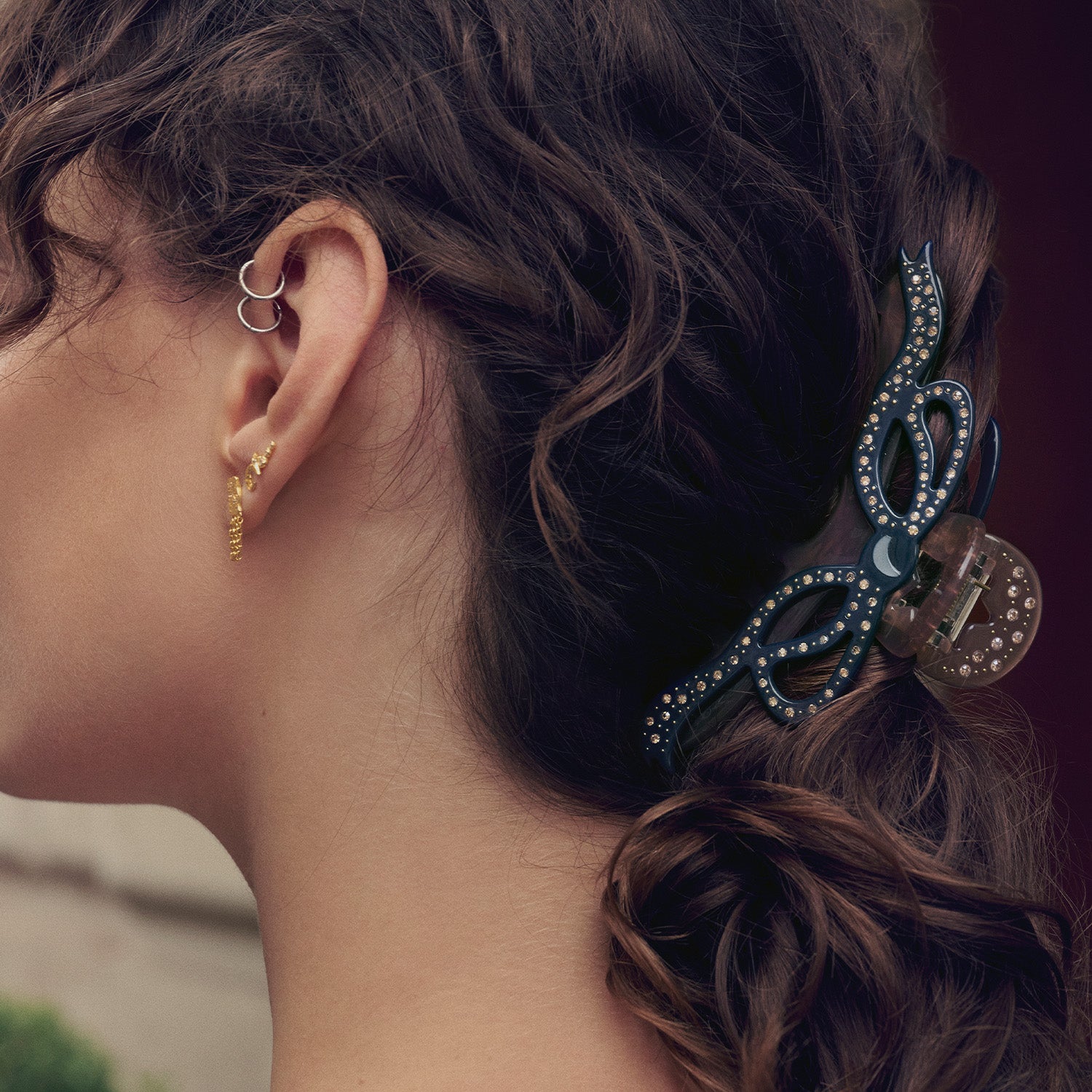 De infällda detaljerna ger ett extra lager av elegans, medan den raffinerade rosettformen framhäver din personliga stil. Detta hårspänne är inte bara ett praktiskt verktyg, utan också ett smycke som kan lyfta vilken outfit som helst.