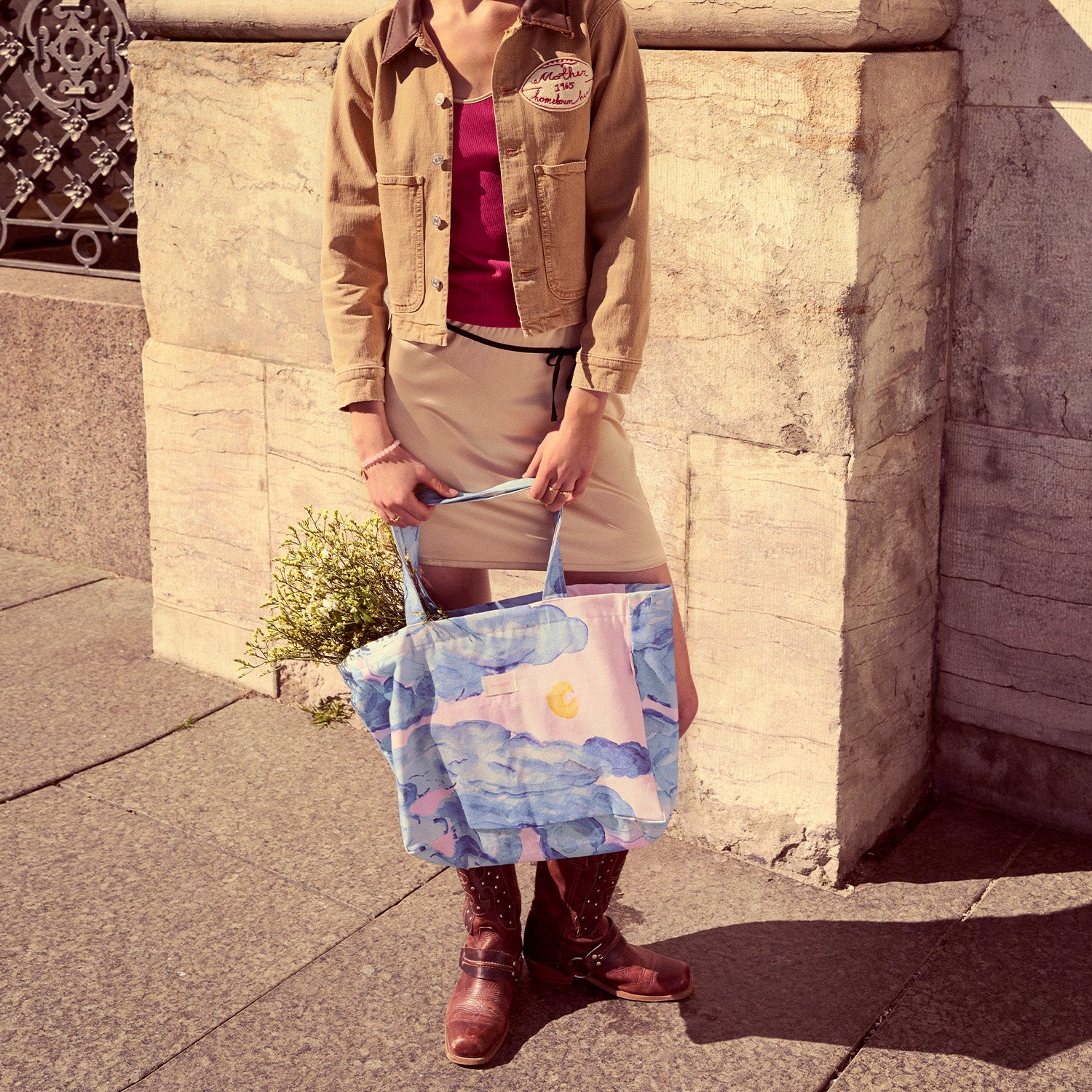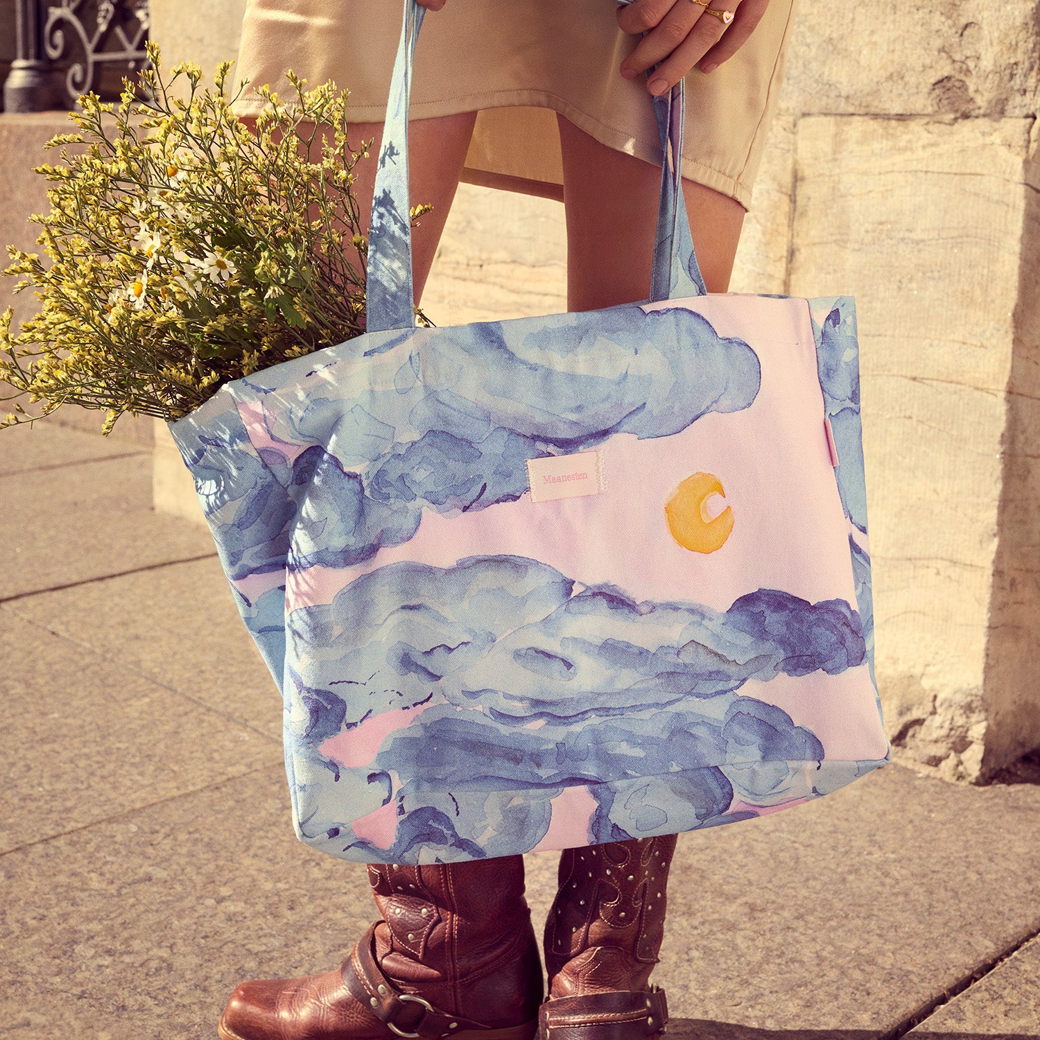 Väskan är prydd med en hisnande design som påminner om en drömsk himmel med mjuka, blå moln och en gyllene måne. Den mjuka bomullsstrukturen ger en behaglig känsla, medan de robusta remmarna säkerställer bekväm bärkomfort. Färgerna är harmoniska och skapar en känsla av lugn och elegans.