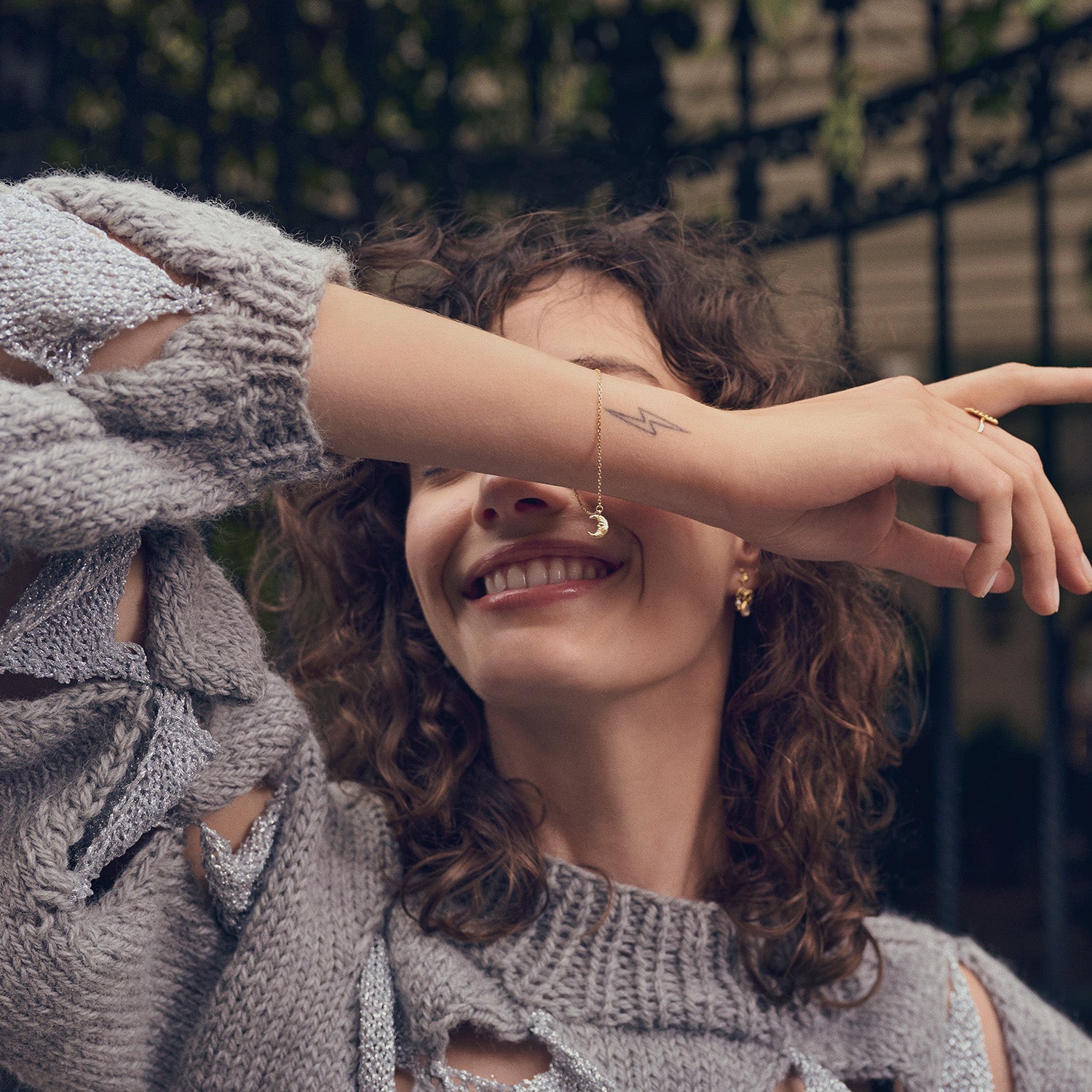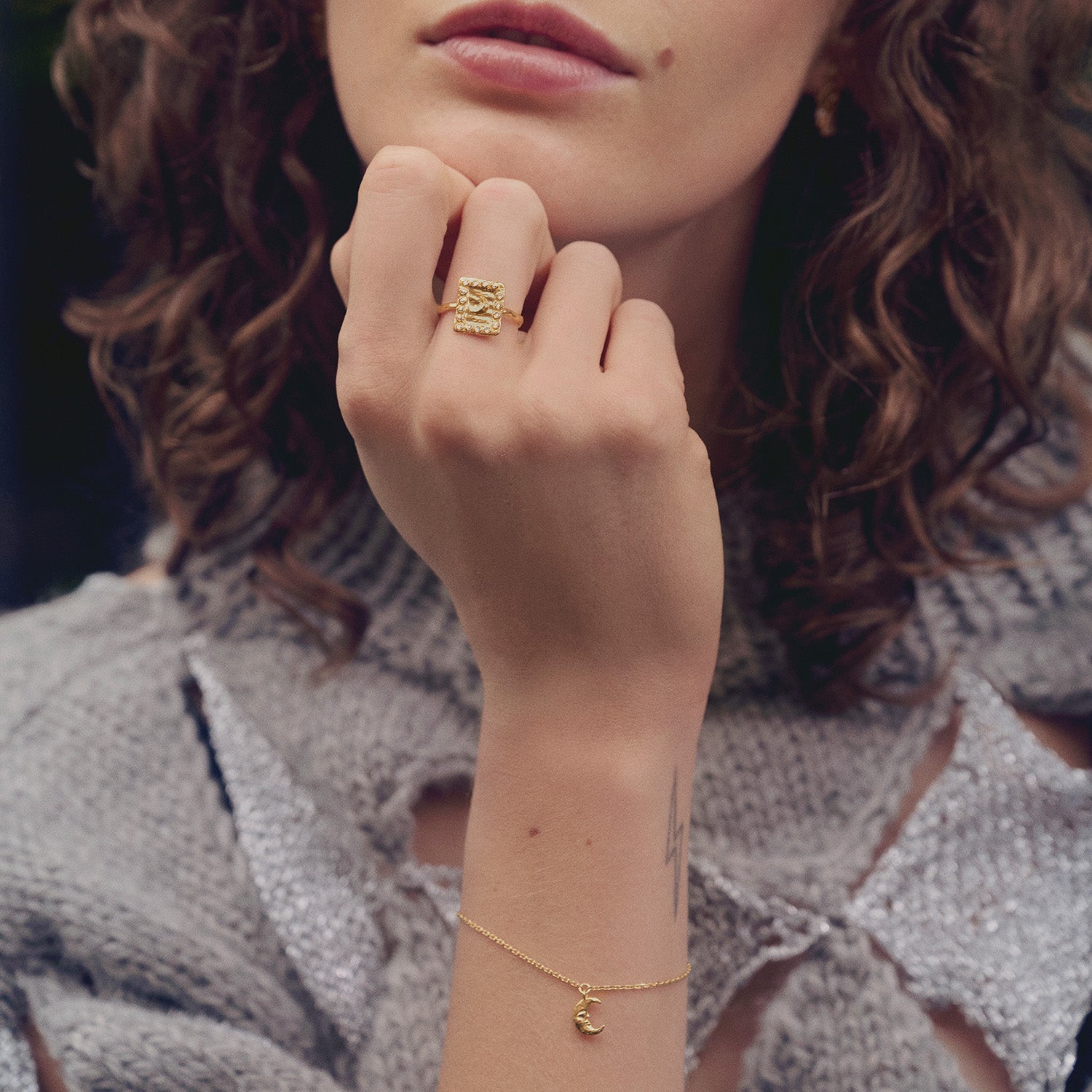 Armbandet är tillverkat av förgyllt silver, vilket ger det en lyxig och tidlös känsla. Den gyllene färgen spelar vackert med ljuset och framhäver de fina detaljerna i månsymbolen som hänger elegant från kedjan. Kedjans subtila textur ger en känsla av lätthet och rörelse, vilket gör den bekväm att bära hela dagen.