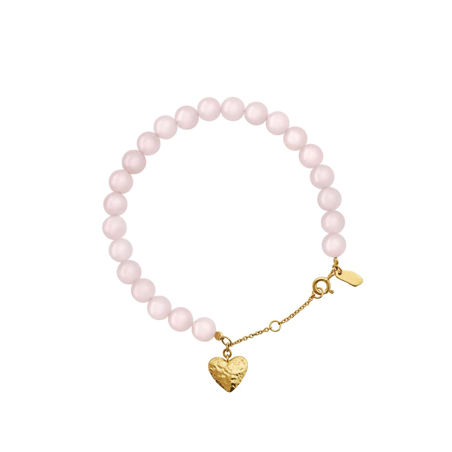 Armbandet består av fina pärlor i en mjuk rosa nyans, vilket skapar en harmonisk kontrast till det förgyllda hjärthänget. Den fina kedjan och de släta pärlorna ger en behaglig känsla mot huden, medan det gyllene hjärtat tillför en romantisk detalj. Med en längd på 16+3 cm kan armbandet justeras för att passa perfekt på din handled.