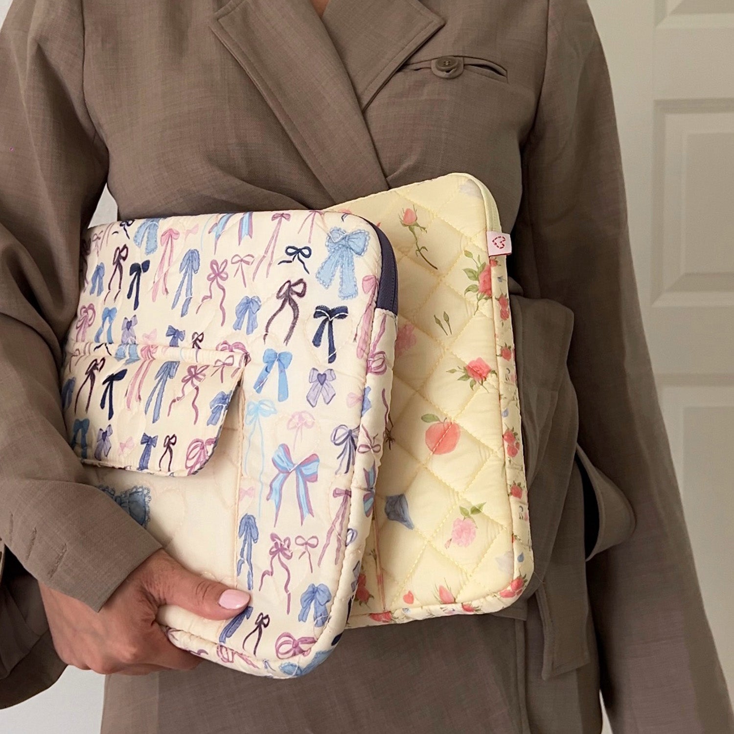 Denna datorfodral är gjord av mjuk textil som känns behaglig att ta vid. De delikata rosetterna i olika nyanser av blått och rosa skapar en harmonisk och inbjudande estetik. Den subtila färgpaletten gör den lätt att matcha med andra tillbehör.