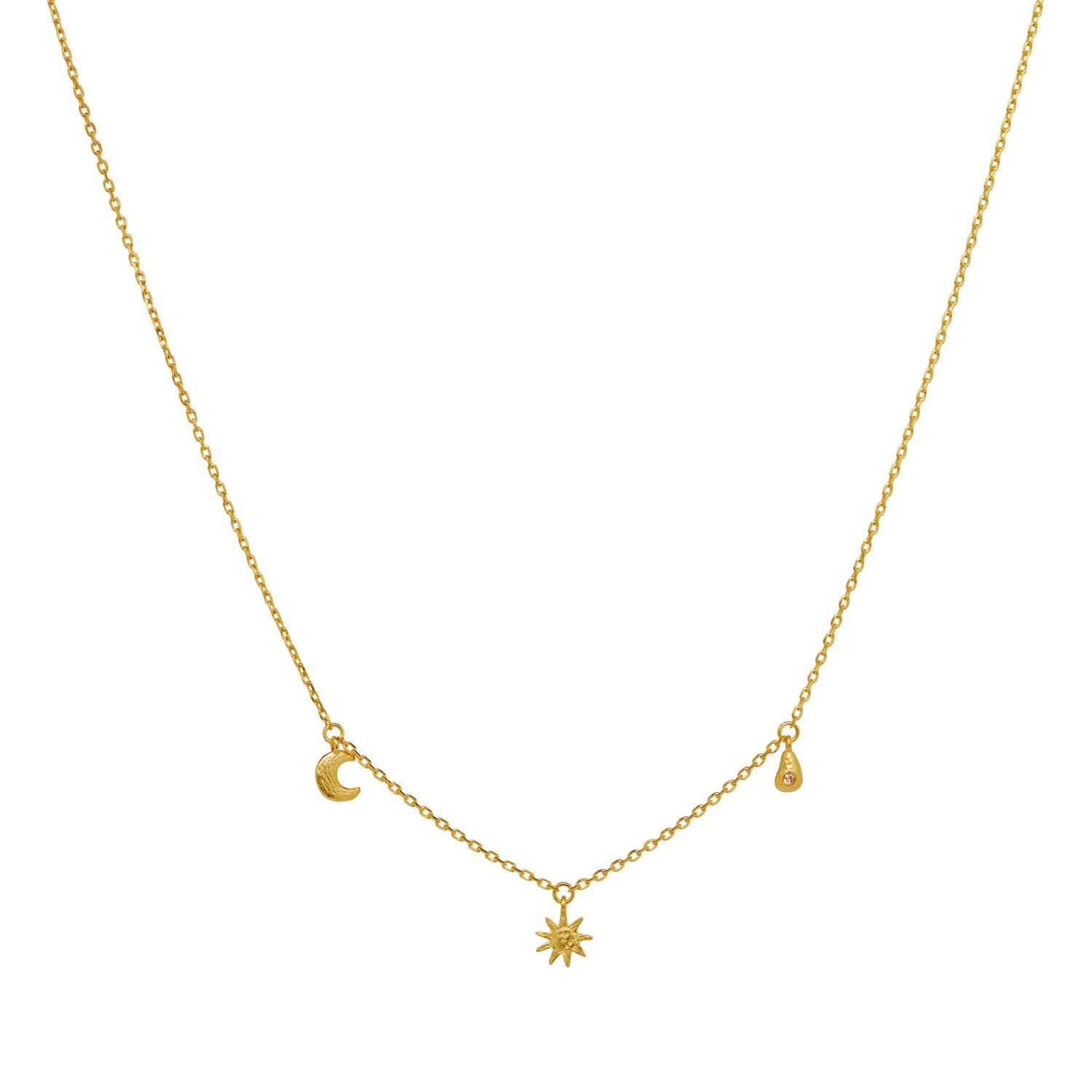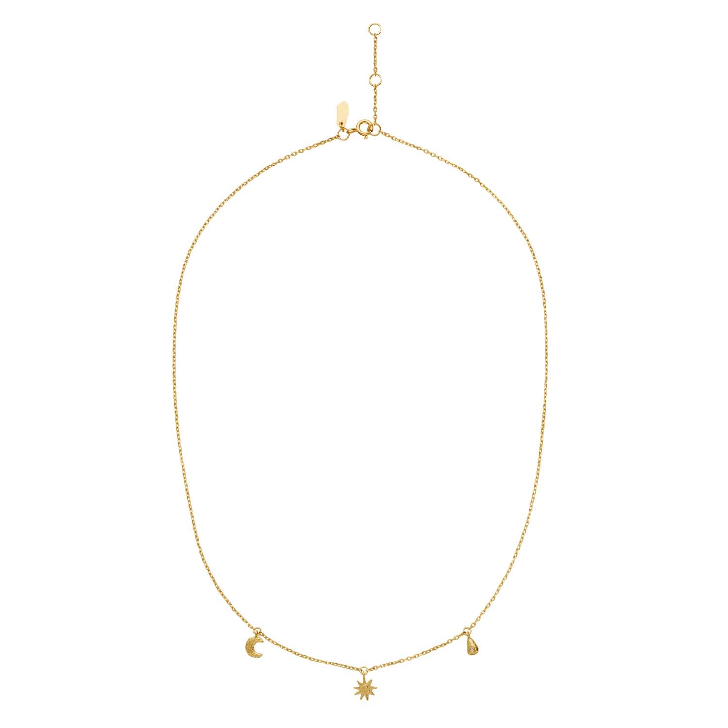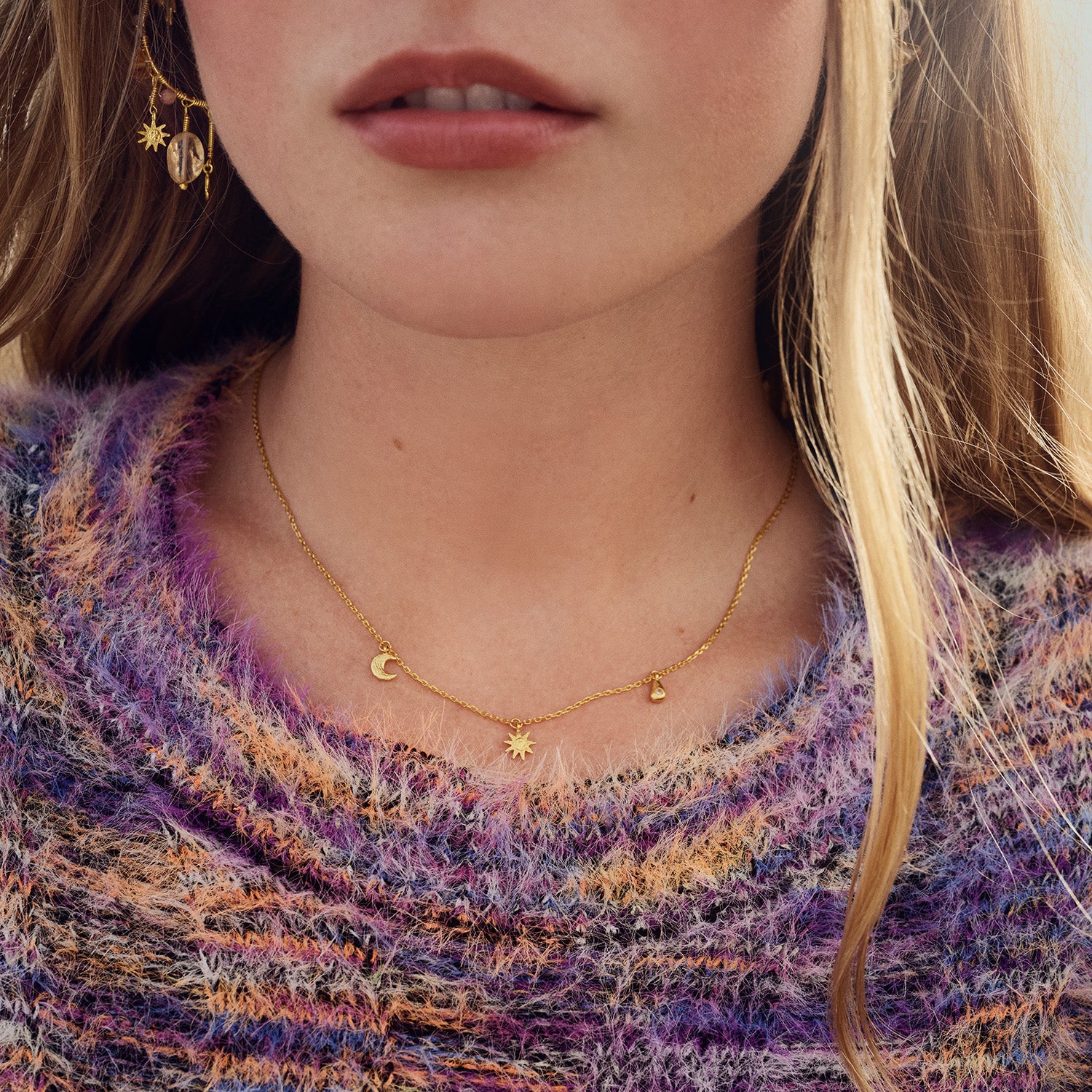 Sadie-halsbandet är utsmyckat med fina hängen som inkluderar en måne, en stjärna och en droppe. Dessa symboler ger smyckena en unik charm och personlighet. Den fina kedjan och de små detaljerna skapar en lätt och luftig känsla som gör halsbandet bekvämt att bära hela dagen.
