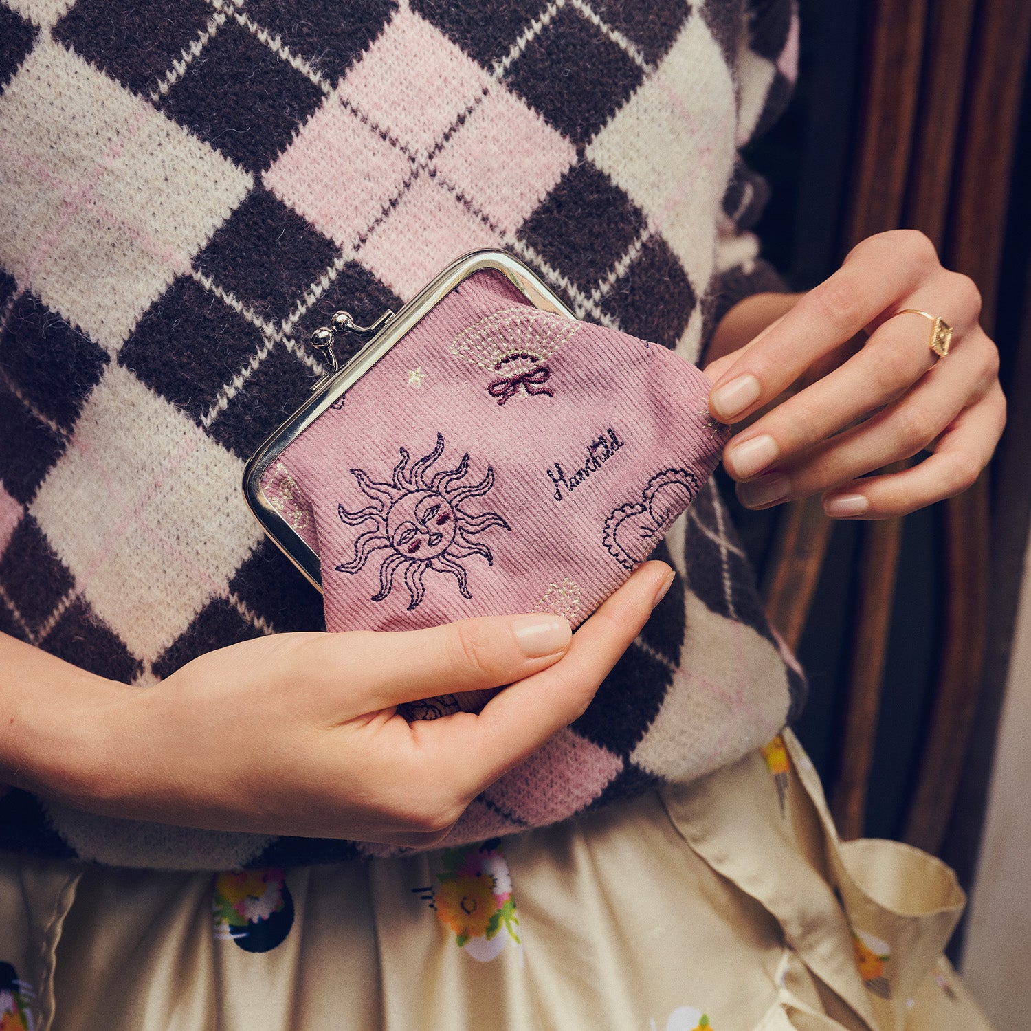 Den lila färgen är både djup och livfull, vilket gör väskan till ett iögonfallande accessoar. Den mjuka textilstrukturen känns bekväm i handen och ger en lyxig känsla. De konstnärliga symbolerna hjärtat och solen är vackert broderade, vilket ger en unik och personlig touch.