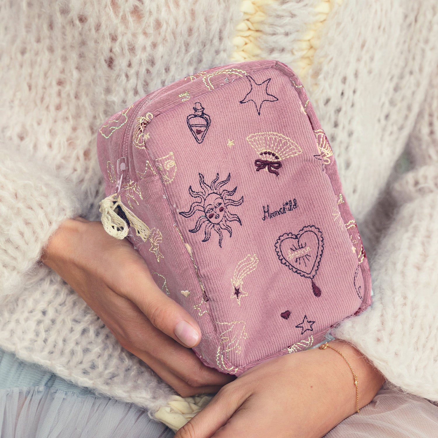 Väskan är tillverkad av mjuk textil i en förtrollande lila färg som omedelbart drar blickarna till sig. De inbyggda symbolerna som hjärtan, stjärnor och solen ger en unik charm som gör den här väskan till mer än bara en praktisk förvaringslösning.