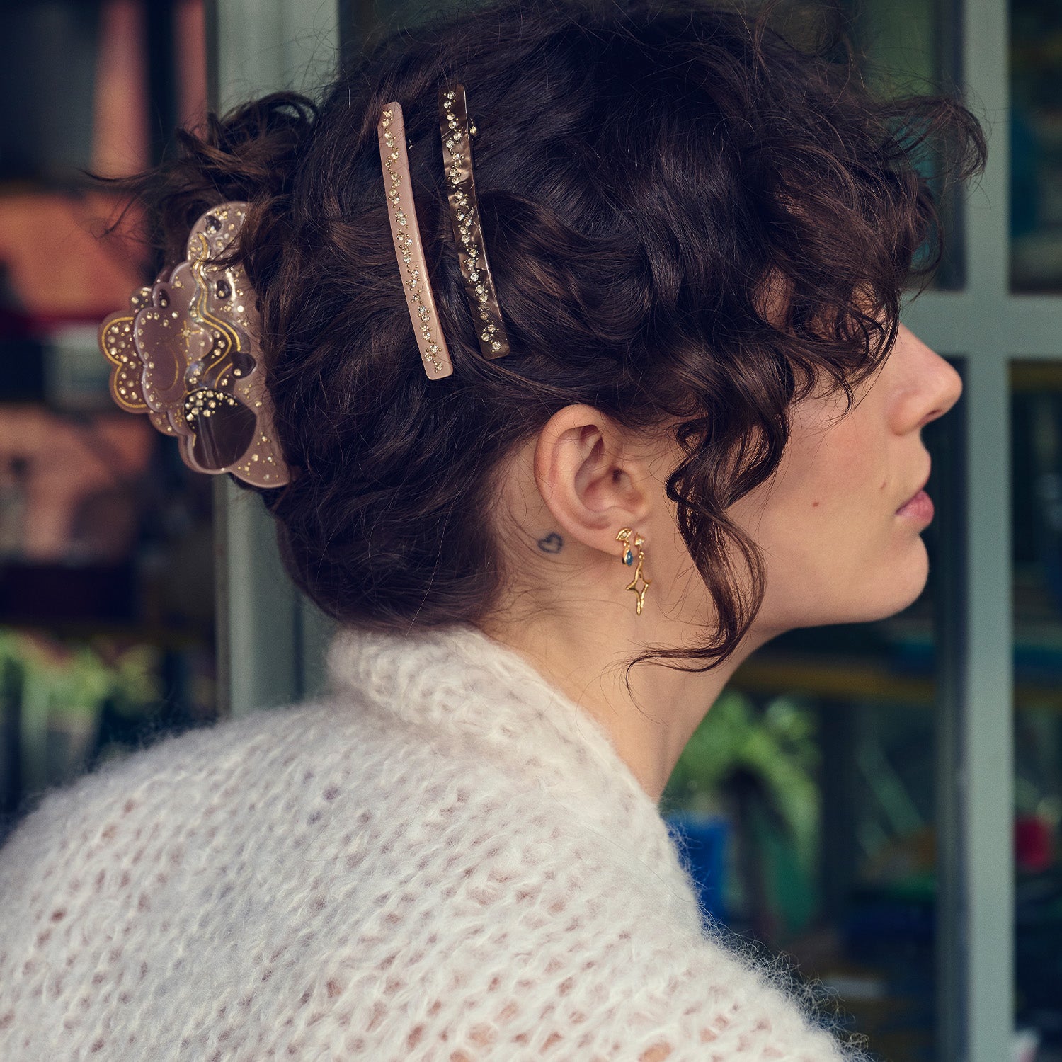 Upplev den eleganta och feminina charmen med hårspännet Maanesten Juin Blush. Detta vackra hårspänne är utformat för att ge en touch av elegans till alla tillfällen, oavsett om det är en konfirmation, examenspresent eller en present till henne.