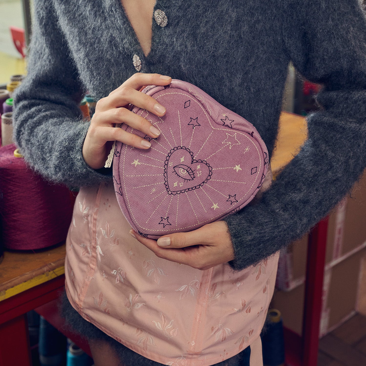 Den lila färgen skapar en lugn och elegant atmosfär som kompletterar det fina broderiet av stjärnor och månar. Väskan hjärtformade design ger den ett feminint och lekfullt uttryck som är både iögonfallande och charmigt. Det mjuka textilmaterialet känns lyxigt och gör väskan till ett nöje att använda dagligen.