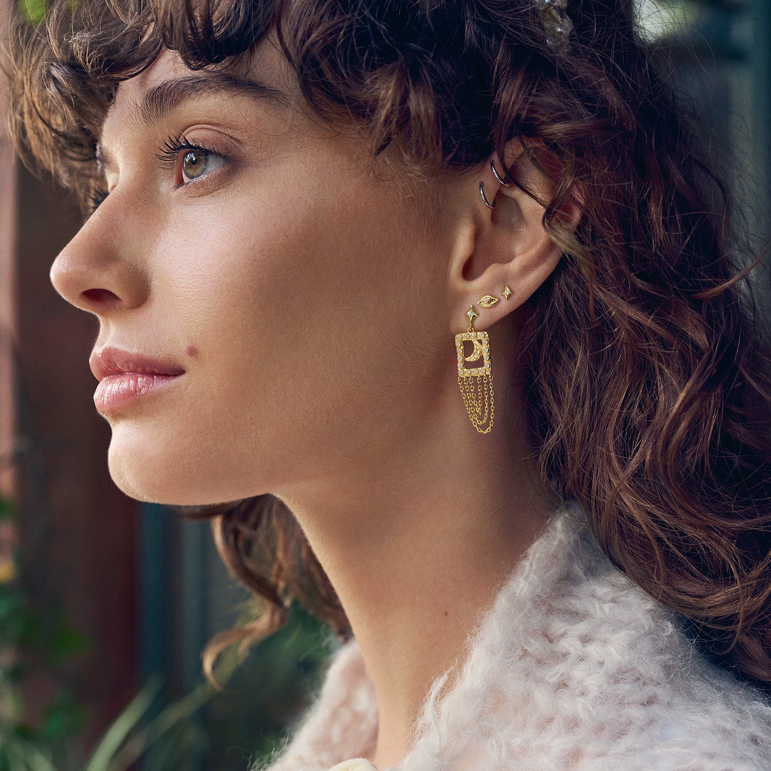 De guldpläterade örhängena utstrålar ett varmt gyllene sken som kompletterar alla hudtoner. Deras delikata form och fina detaljer gör dem till en mångsidig accessoar som kan bäras både till vardags och på fest.