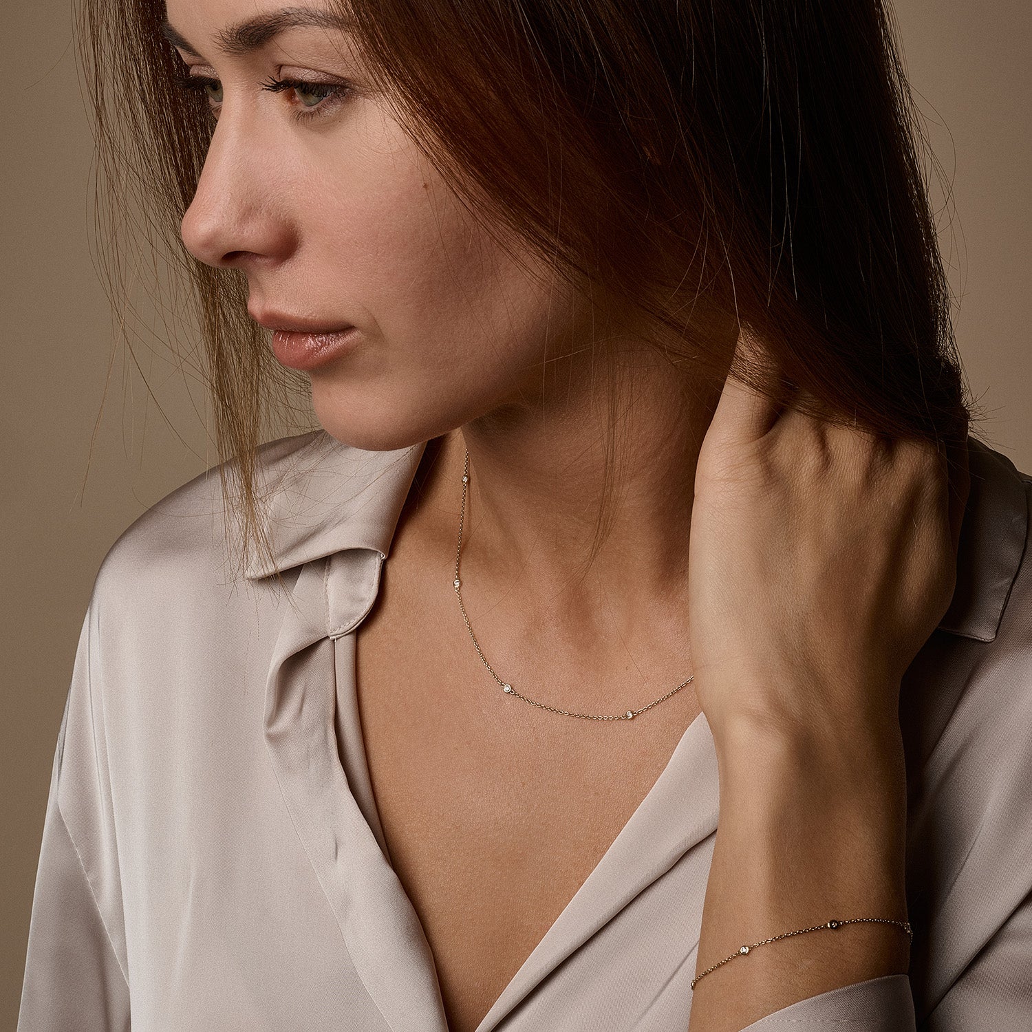 De strategiskt placerade diamanterna längs kedjan skapar ett subtilt men ändå iögonfallande uttalande som lägger till en extra dimension av lyx till din look. Den släta ytan på det vita guldet och de blanka diamanterna samverkar för att skapa ett armband som är både elegant och tidlöst.