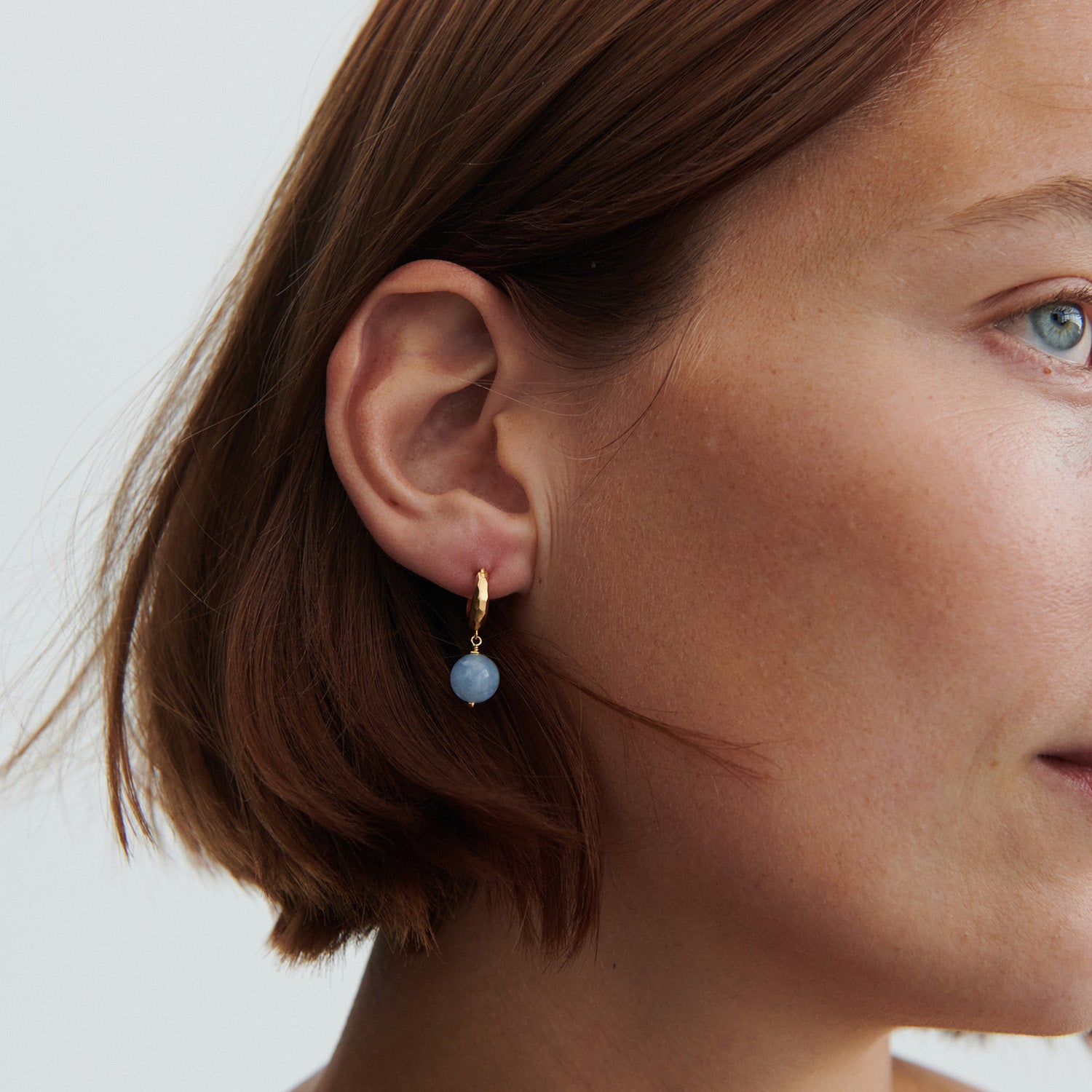 Örhängena är tillverkade av glänsande silver, vilket ger en sofistikerad look. Den blå stenen hänger elegant från en enkel silverring, vilket skapar en vacker kontrast och drar till sig uppmärksamhet. Stenens släta yta och klara färg ger en känsla av lugn och elegans.