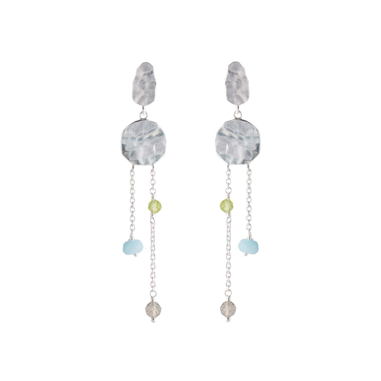 Örhängenas design är en vacker kombination av moderna och tidlösa element. De fina kedjorna som hänger från en texturerad silverplatta skapar en dynamisk rörelse när du bär dem. De små färgade pärlorna ger en lekfull touch som fångar ljuset och skapar en subtil glans.