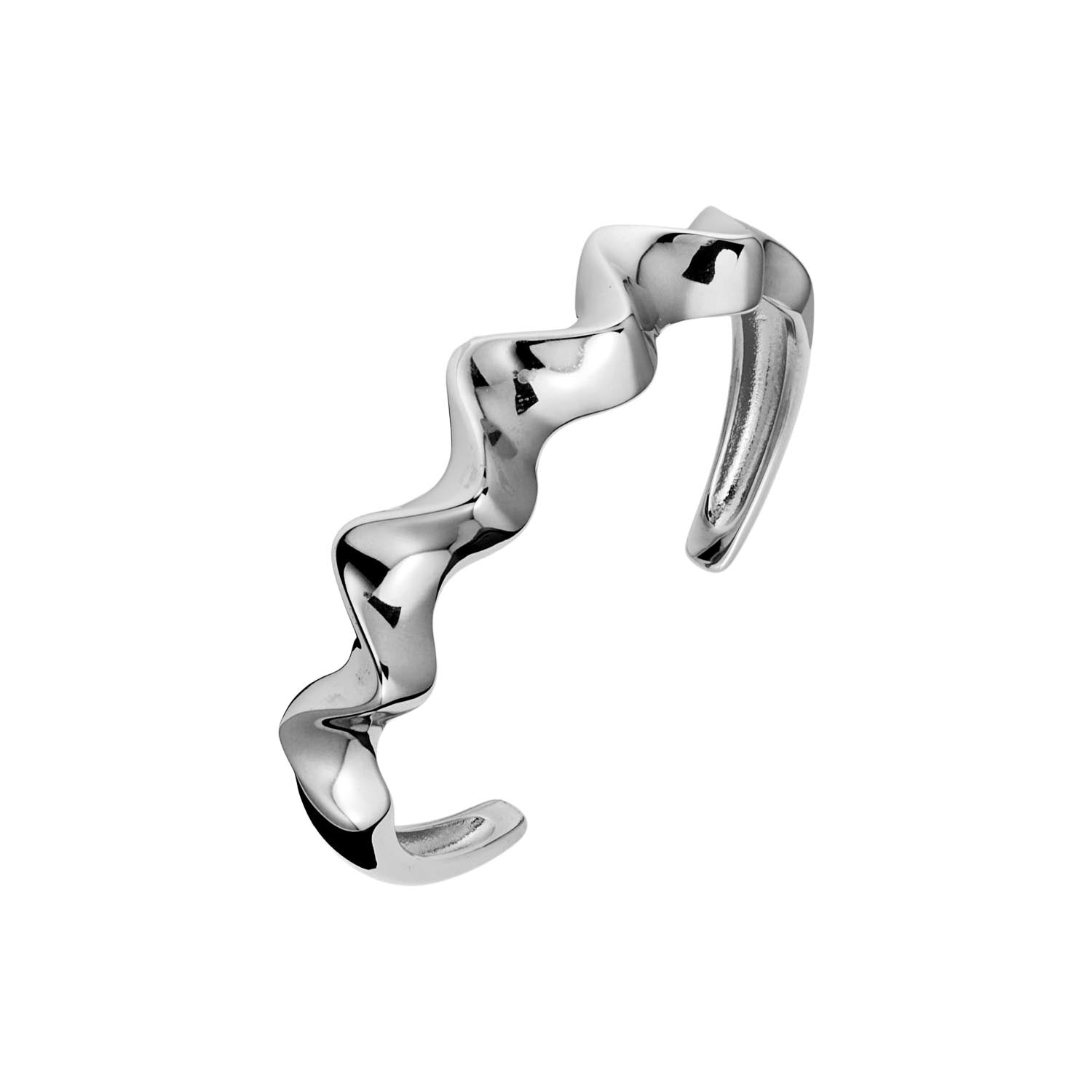 Armbandets silverfärgade finish reflekterar ljuset vackert och framhäver dess skulpturala form. Den släta ytan känns bekväm mot huden och gör den enkel att bära hela dagen. Med en diameter på 62 mm passar den de flesta handleder perfekt, och dess öppna design gör den enkel att ta på och av.