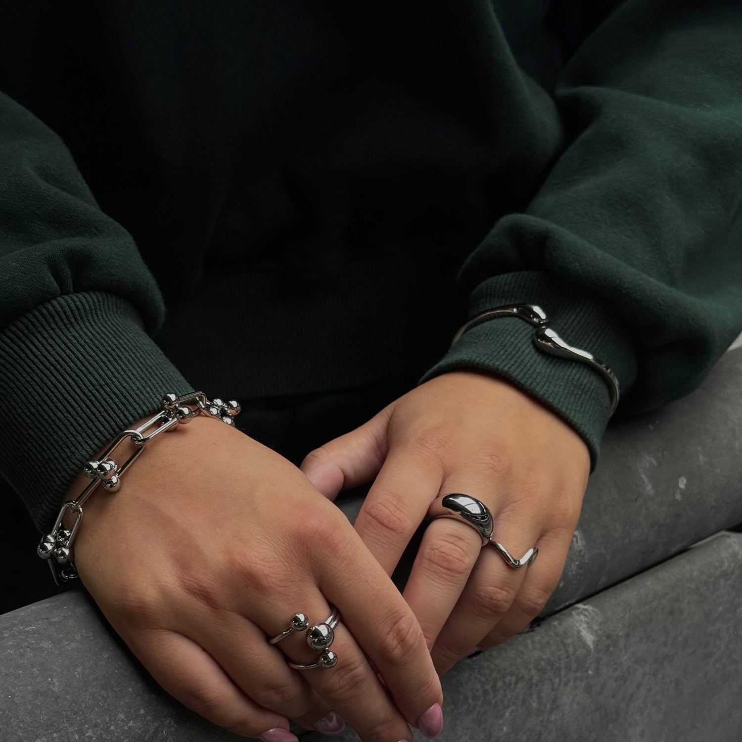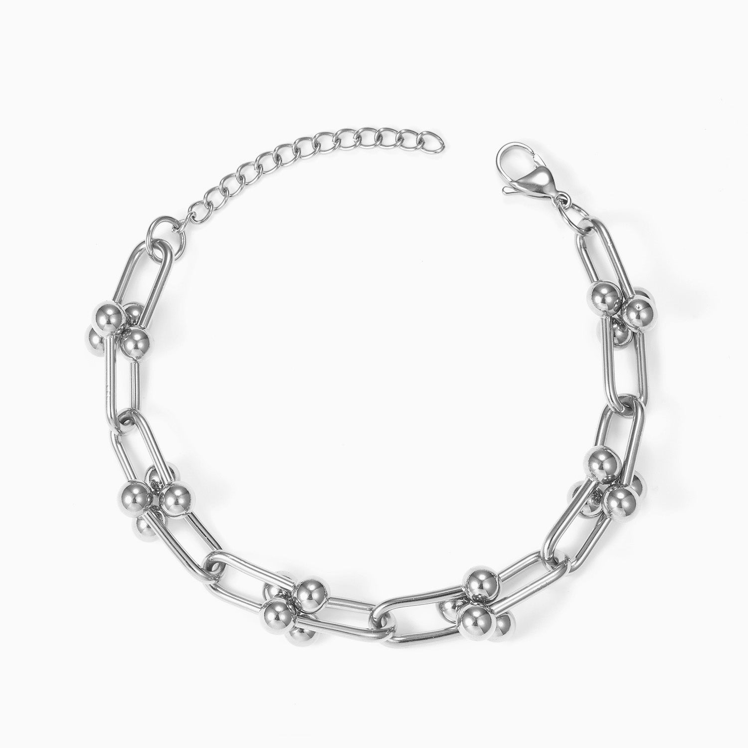 Armbandet är sammansatt av fina kedjelänkar, vilket ger det ett modernt och sofistikerat utseende. De små, polerade kulorna som pryder kedjan ger en subtil detalj som fångar ljuset vackert. Detta skapar en dynamisk glans som gör armbandet till ett iögonfallande accessoar.