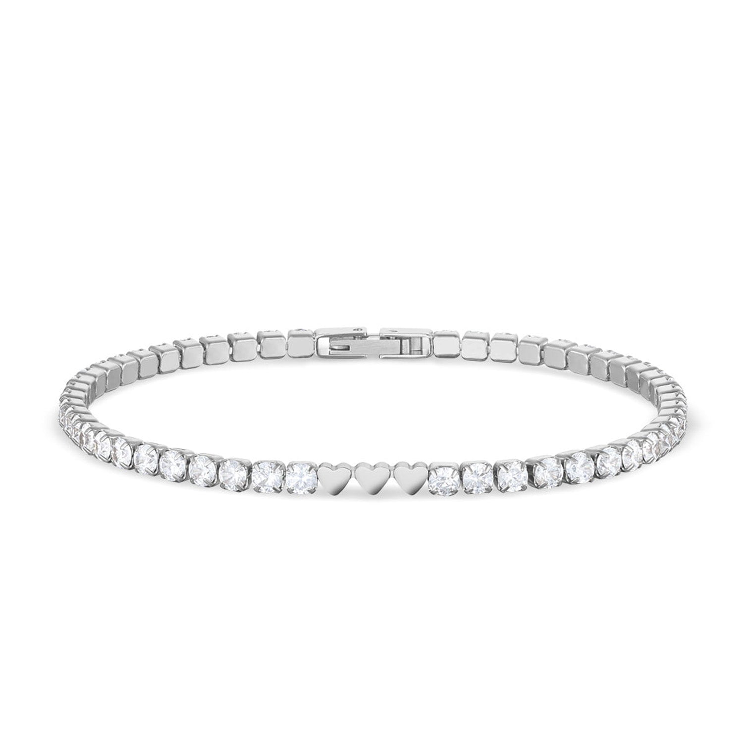 Detta silverfärgade armband i rostfritt stål utstrålar tidlös elegans. De infällda kubiska zirkoniastenarna fångar ljuset vackert och ger din handled en subtil glöd. Hjärtan är noggrant placerade för att skapa en harmonisk balans som framhäver armbandets raffinerade design.