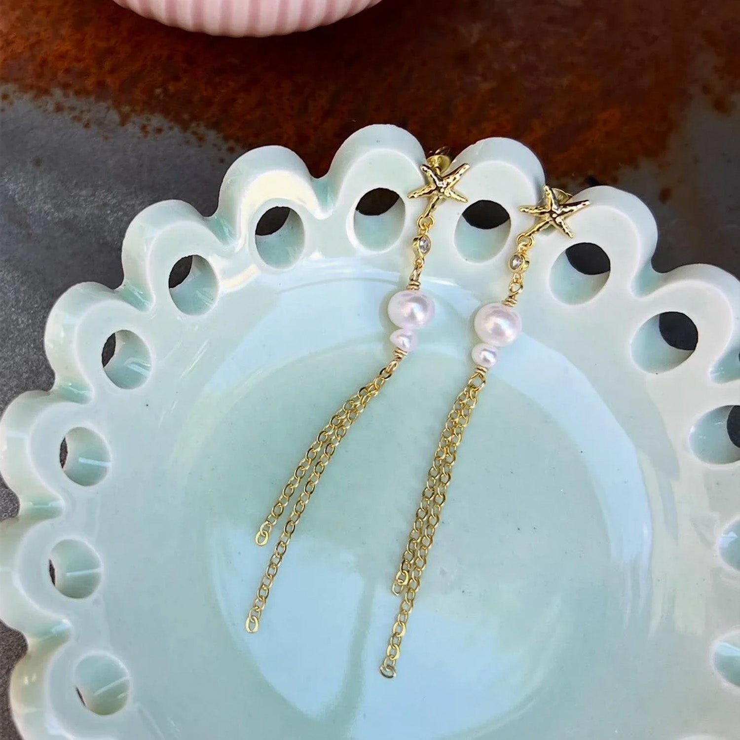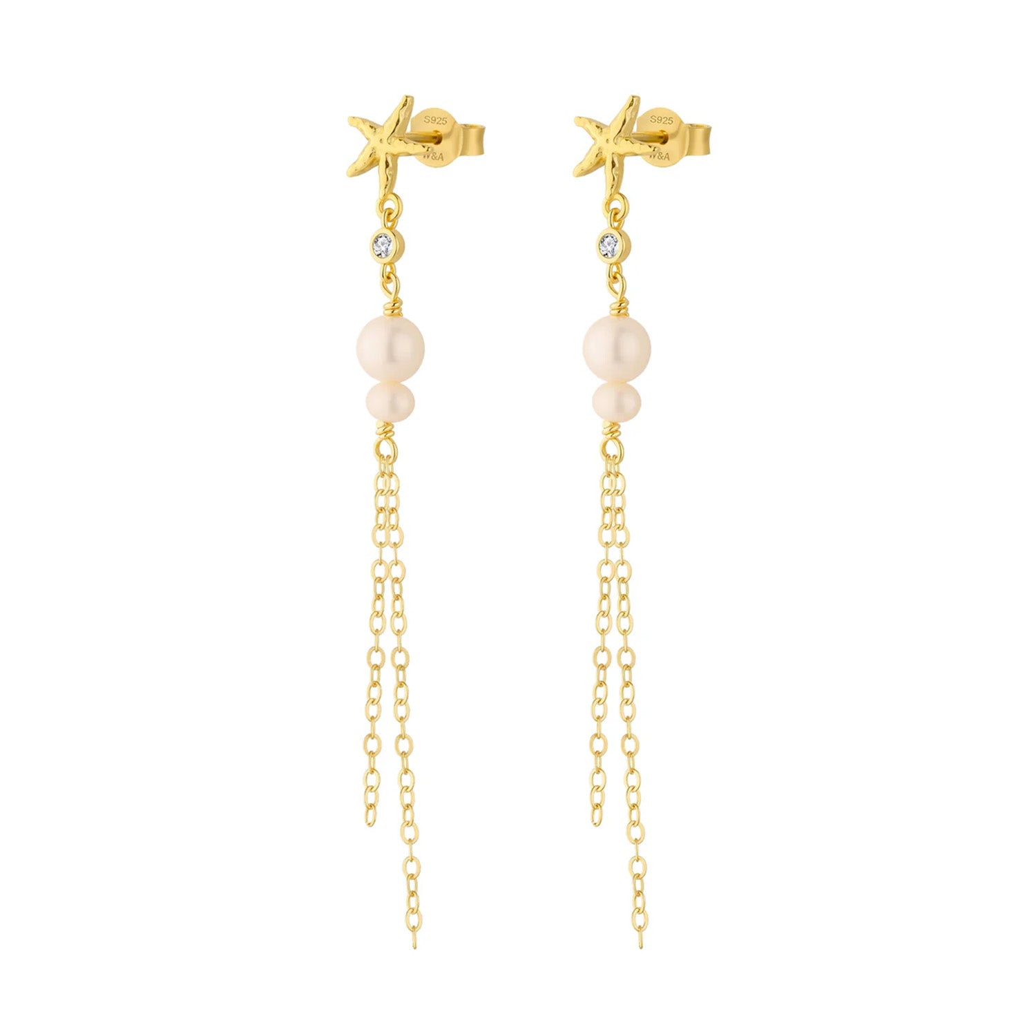 Øreringene er udsmykket med delikate perler og funklende sten, der tilføjer et strejf af glamour. Den gyldne farve skaber en varm og indbydende glød, mens de lange kæder giver et sofistikeret og feminint udtryk. Stjerneformede detaljer øverst på øreringene tilføjer en unik karakter, der fanger opmærksomheden.