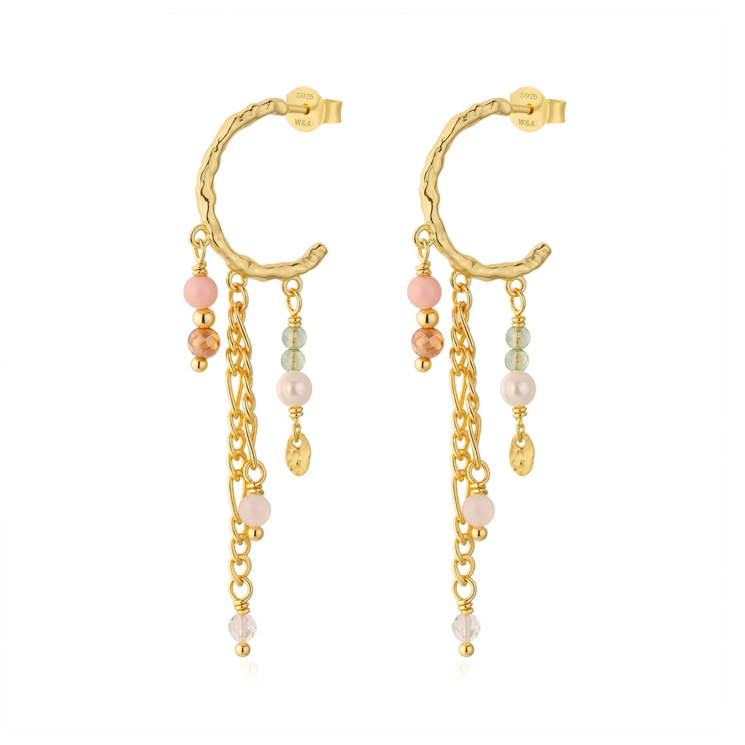 Disse øreringe er en sand fryd for øjet. De forgyldte sølvbøjler har en elegant, bølget tekstur, der fanger lyset smukt. De hængende kæder er udsmykket med en harmonisk blanding af perler og farverige sten, der skaber en livlig og feminin æstetik. De bløde pastelfarver i stenene tilføjer en subtil farvepragt, mens de gyldne kæder giver et luksuriøst touch.