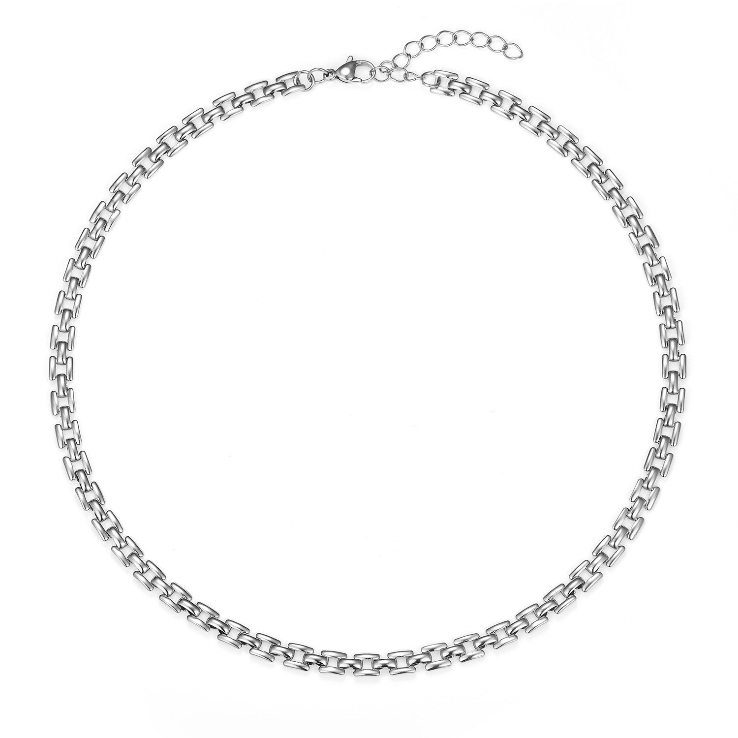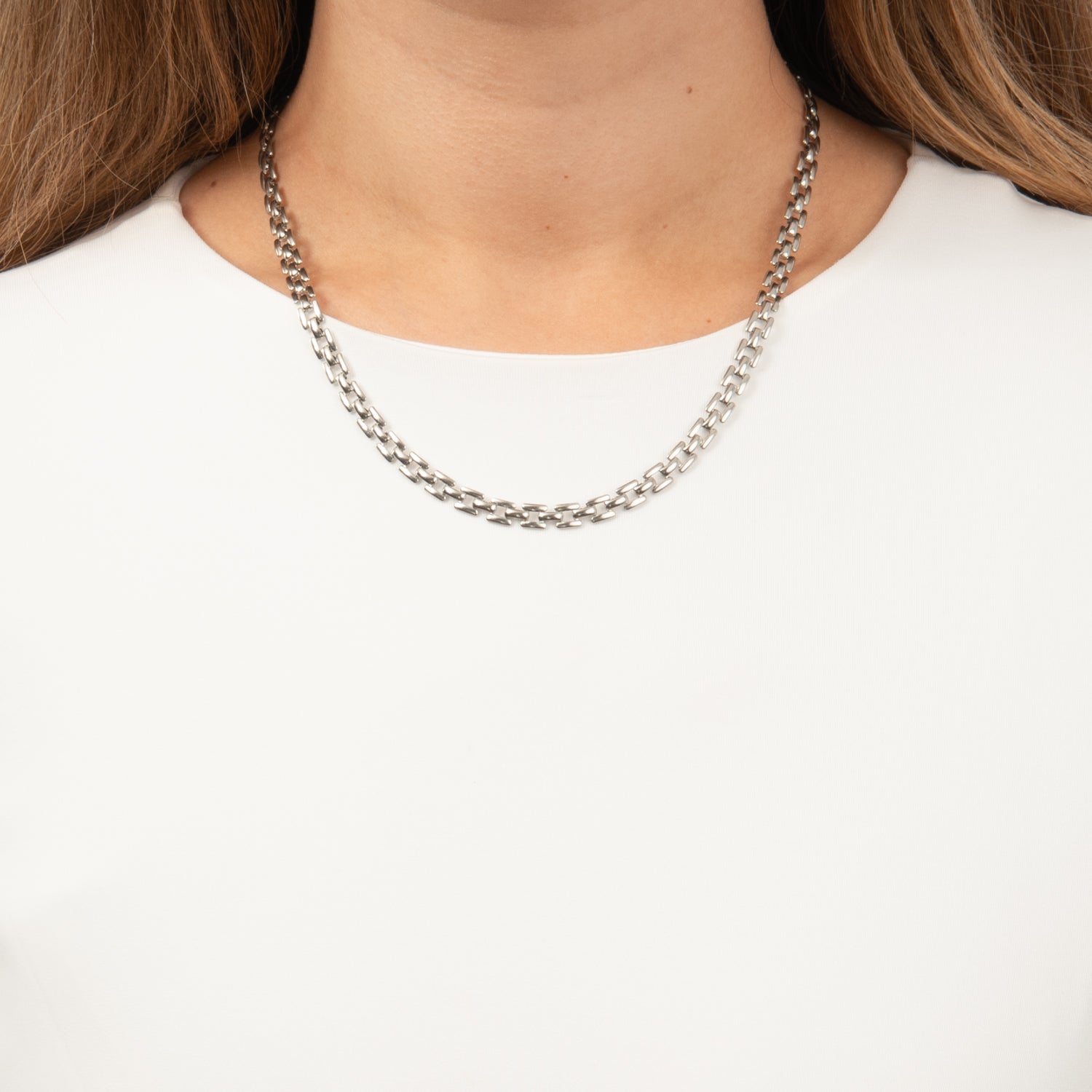 Halsbandets fina länkar känns lena och bekväma mot huden, medan den glänsande silverfärgen reflekterar ljuset vackert. Den subtila glansen och minimalistiska designen gör det till ett mångsidigt smycke som kan bäras ensamt eller tillsammans med andra favoriter.