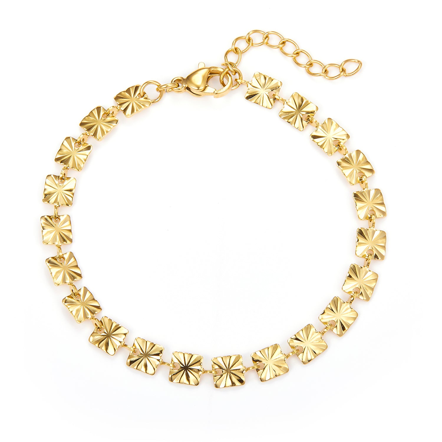 Armbandet består av små, fyrkantiga länkar som skapar ett modernt och elegant uttryck. Den gyllene färgen ger en varm och inbjudande glöd som kompletterar alla hudtoner. Varje länk är noggrant polerad för att uppnå en slät och blank yta som känns bekväm mot huden. Kedjemönstret på plattorna är identiskt på fram- och baksidan.
