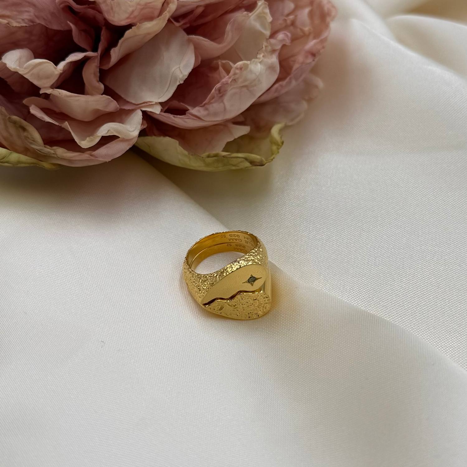 Den gyllene färgen och den enkla men eleganta designen gör ringen till en tidlös klassiker som kan bäras ensam eller kombineras med andra smycken för en lager-på-lager-look. Camille Brinch har skapat en ring som inte bara är vacker, utan också bär en djupare mening.