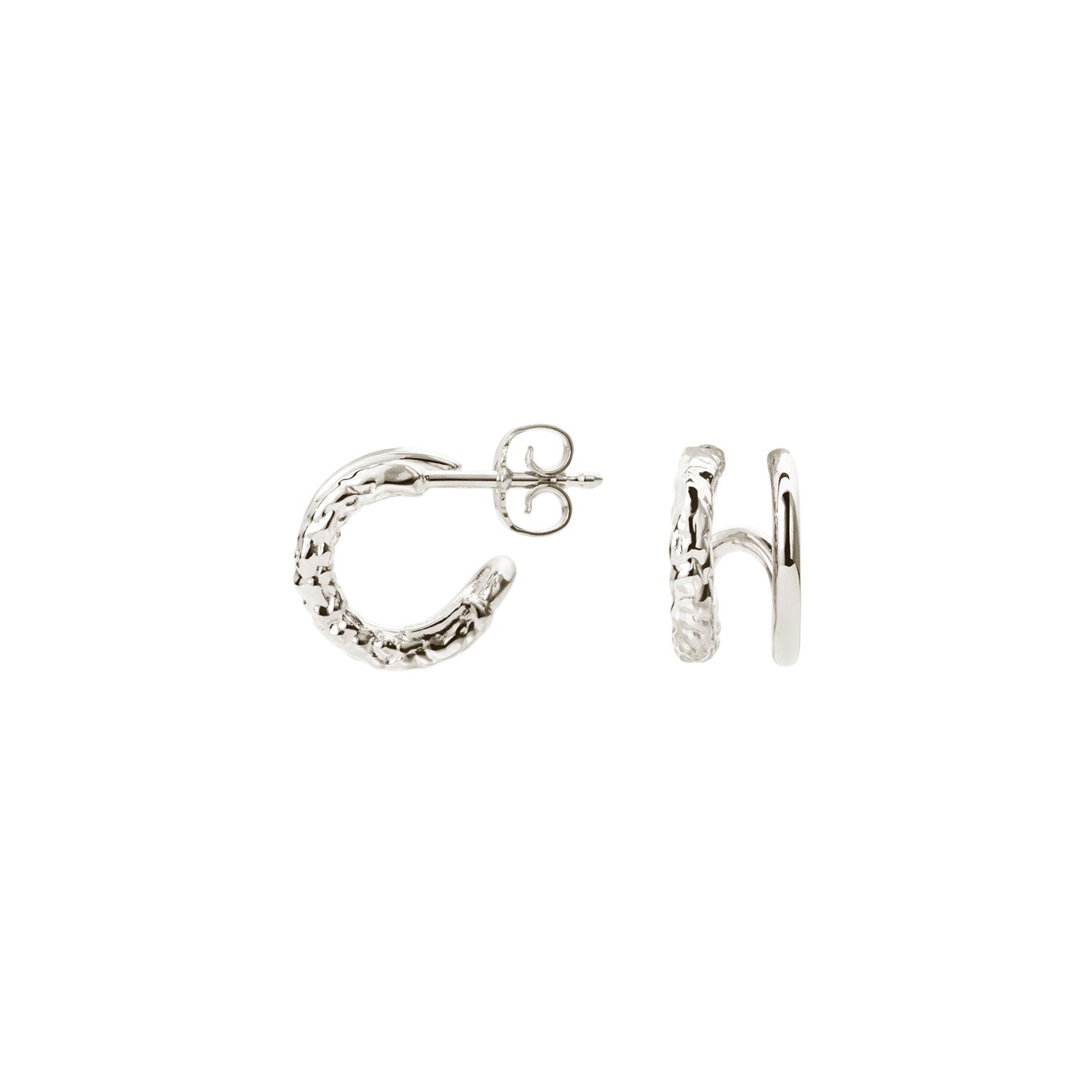 Dessa örhängen är tillverkade i ett skimrande silver som fångar ljuset vackert och framhäver deras fina struktur. Den subtila texturen på ytan ger ett unikt utseende som sticker ut utan att vara flashigt. Örhängena har en modern form som kombinerar enkelhet med en raffinerad estetik, vilket gör dem till ett perfekt val för den stilmedvetna kvinnan.
