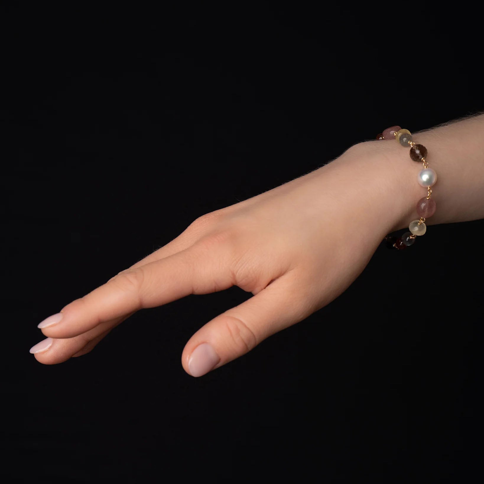 De fina Akoya-pärlorna och ädelstenarna är noggrant utvalda för sin skönhet och kvalitet, vilket gör varje armband unikt. Pärlornas subtila glans och guldets varma toner skapar en harmonisk balans som framhäver armbandets raffinerade design.