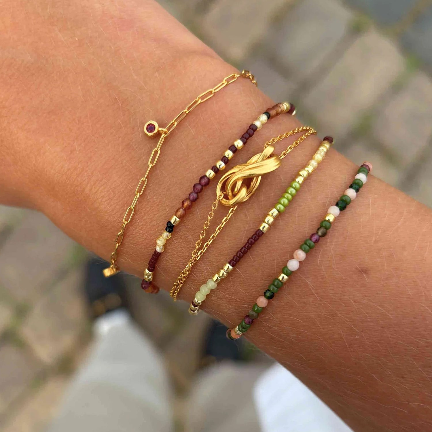 Armbandet är utsmyckat med små, färgglada pärlor som ger en subtil elegans. De gröna och rosa nyanserna skapar en harmonisk balans, medan de gyllene detaljerna framhäver armbandets raffinerade uttryck. Den fina kedjan i förgyllt silver känns lätt och bekväm mot huden, vilket gör det till ett idealiskt val för vardagsbruk.
