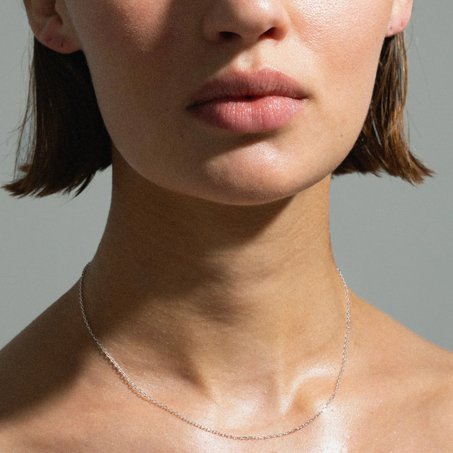 Bilden visar halsbandets fina silverkedja, som utstrålar en diskret elegans. Den delikata texturen och den blanka ytan fångar ljuset vackert och ger ett sofistikerat utseende. Designen är minimalistisk men ändå iögonfallande, vilket gör det till ett mångsidigt smycke som kan bäras ensamt eller i kombination med andra halsband för en lager-på-lager-look.