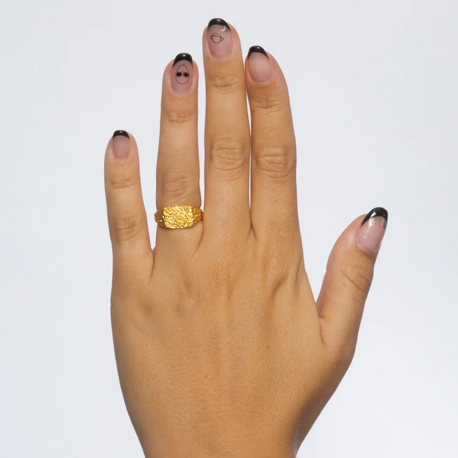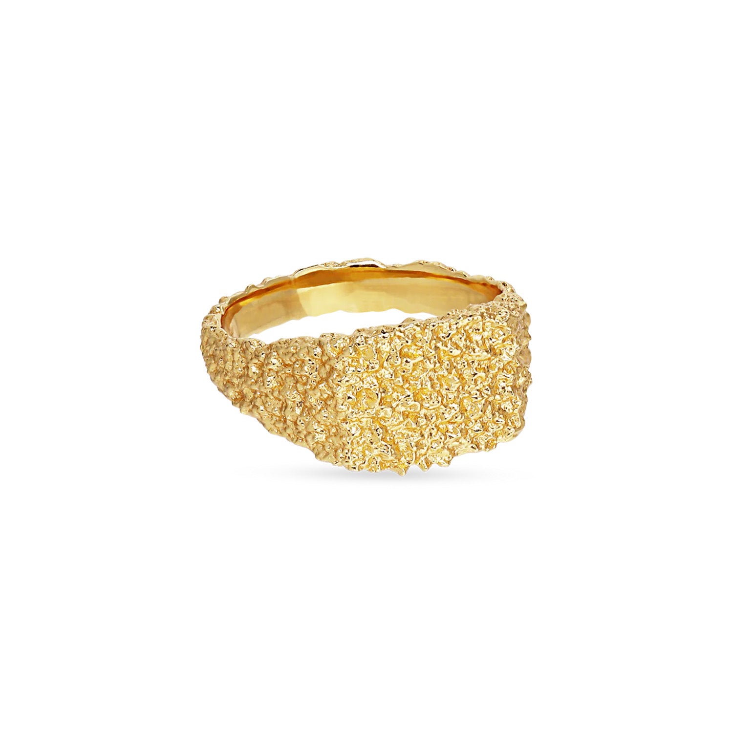 Med sin guldpläterade silverfinish är ringen både elegant och hållbar, vilket gör den till ett perfekt tillskott till din smyckessamling. Den organiska formen ger ringen ett naturligt och unikt uttryck som sticker ut från traditionella signetringar.