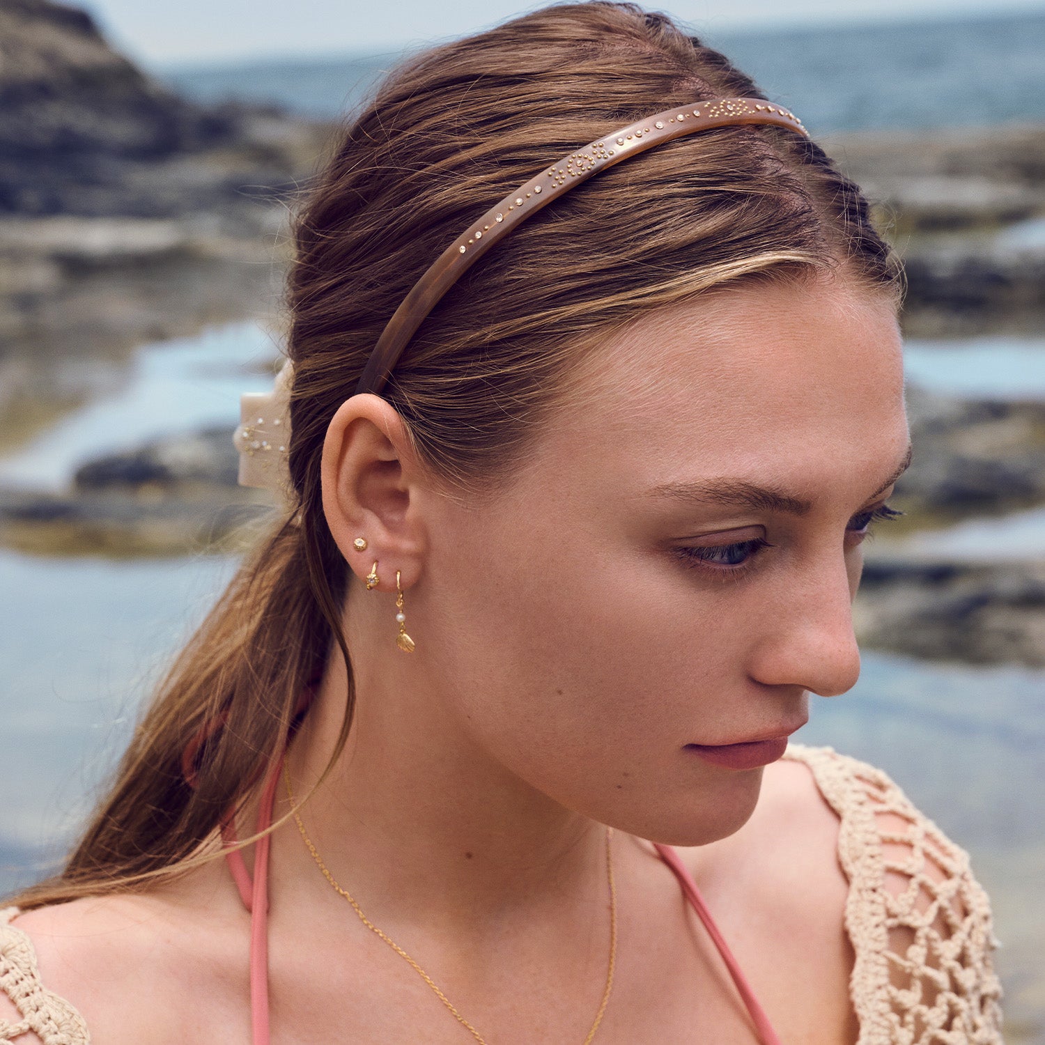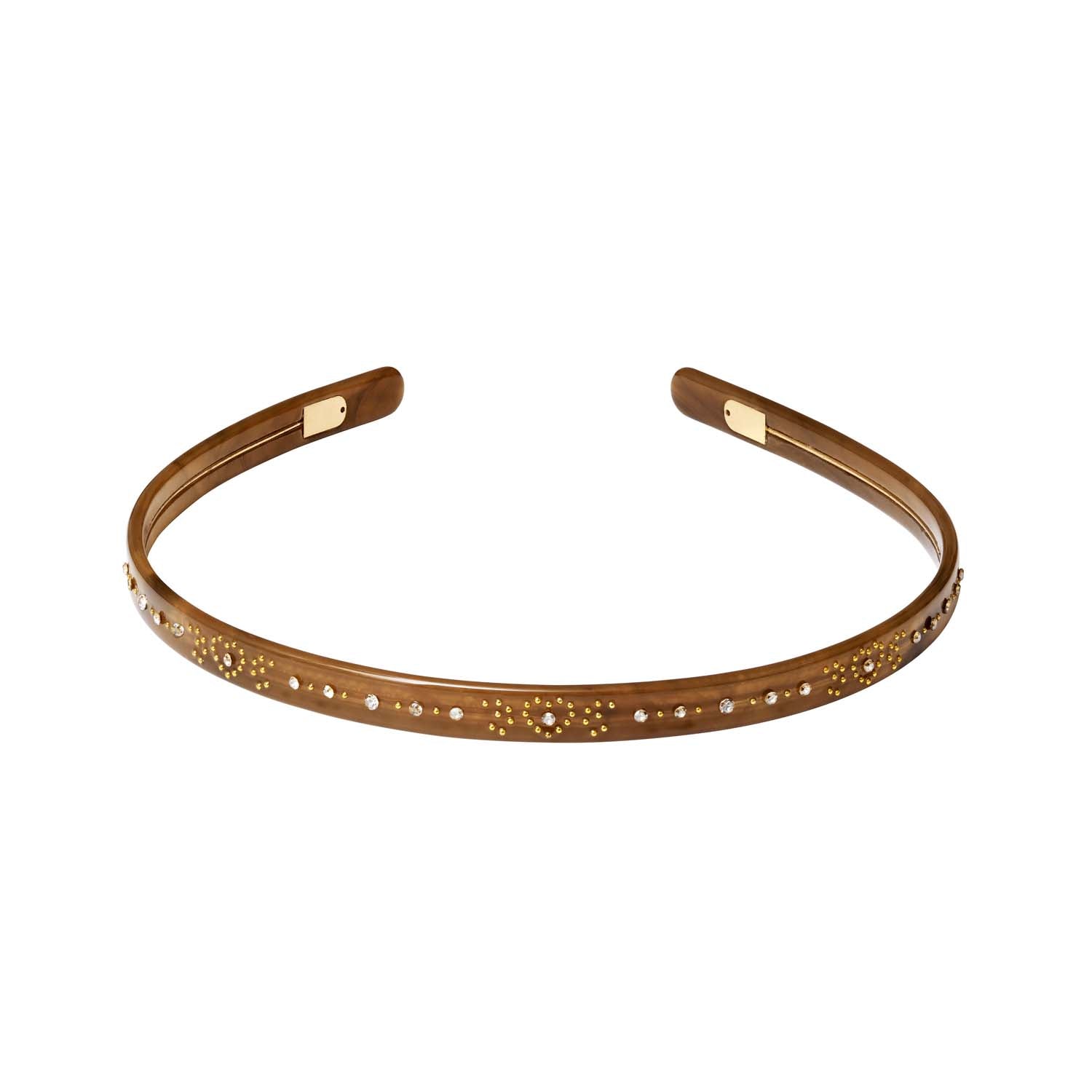 Aziza Mocha-hårklämman är gjord av acetat, vilket ger den en slät och glänsande yta. Den varma, bruna nyansen i kombination med de gyllene detaljerna skapar en harmonisk balans som fångar ljuset vackert. De små, inlagda stenarna ger en subtil glans som framhäver bågen ytterligare.