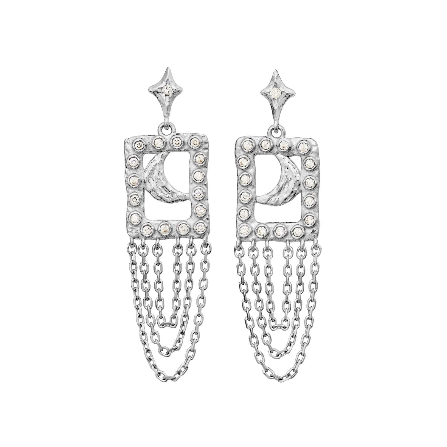 Örhängena har en fascinerande kombination av geometriska former och fina kedjor som skapar en dynamisk rörelse. Den silverfärgade ytan reflekterar ljuset vackert och ger ett subtilt sken som fångar uppmärksamheten. De små detaljerna, som de graverade månsymbolerna, ger en extra dimension av elegans och betydelse.