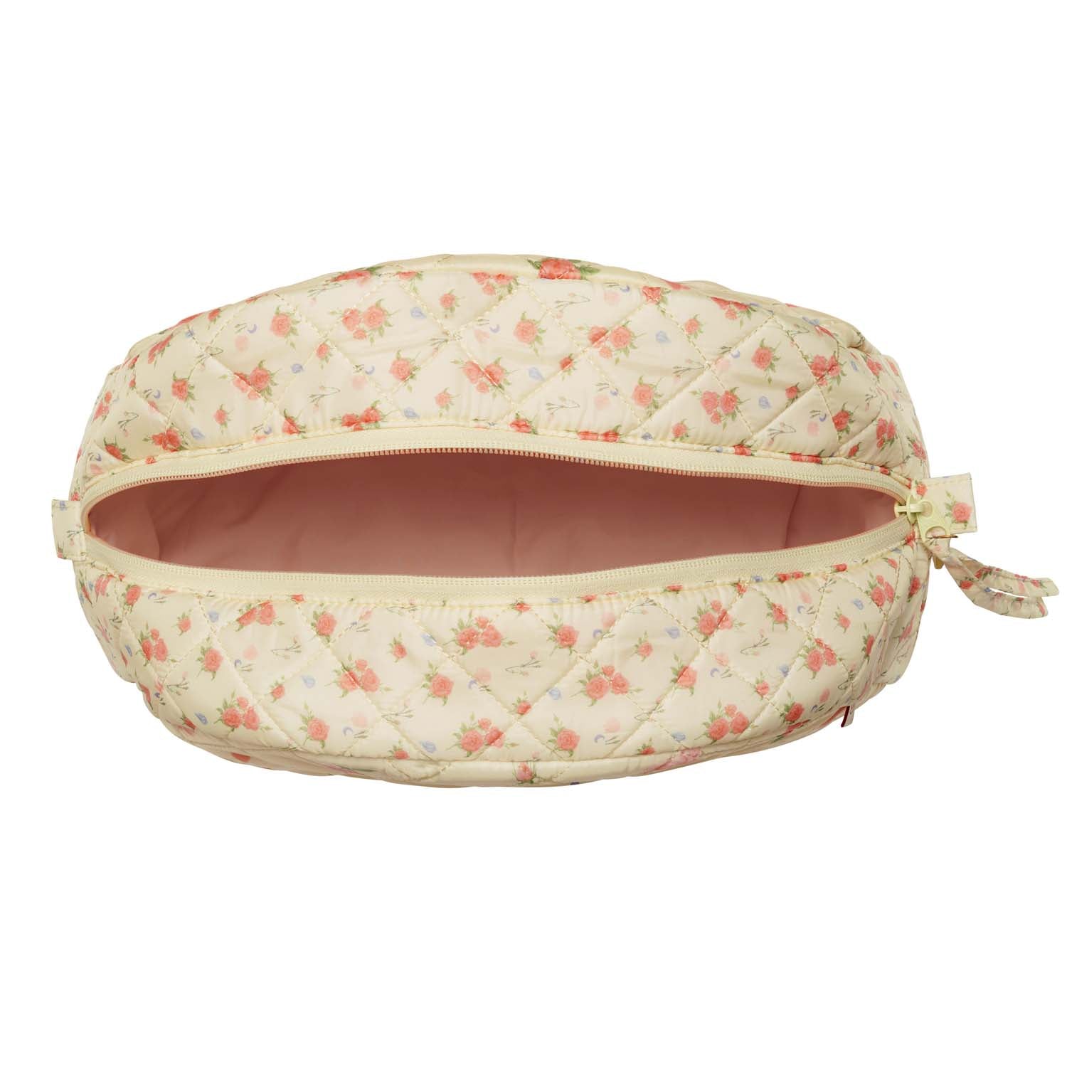 Väskan är gjord av en quiltad textil som ger en mjuk och lyxig känsla. Den ljusa bakgrundsfärgen är dekorerad med delikata rosor och snäckor, vilket skapar en feminin och drömsk look. Den rymliga interiören gör det enkelt att organisera dina sminksaker, medan dragkedjan ser till att allt sitter på plats.
